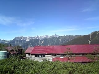赤いトタン屋根の先に見えるとんがりは、どう見ても槍ヶ岳ではないか?