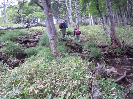 樹林帯に入ると木の根むき出しの悲惨な姿をさらけ出す登山道。