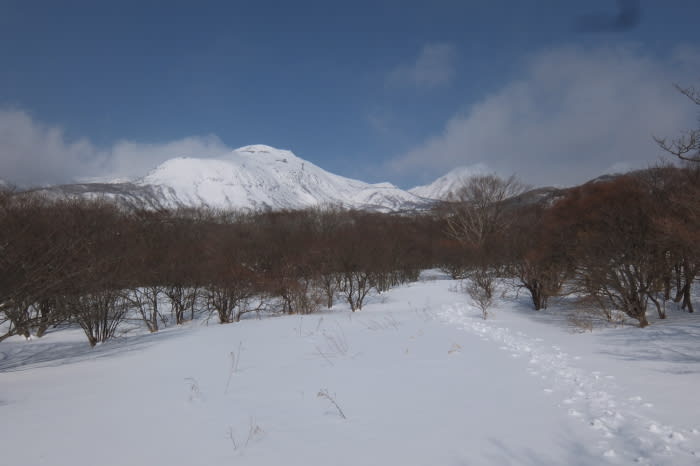突然開けた雪原・・・雪の下は笹原?に出ると、前方にド~ンと那須岳の眺望。