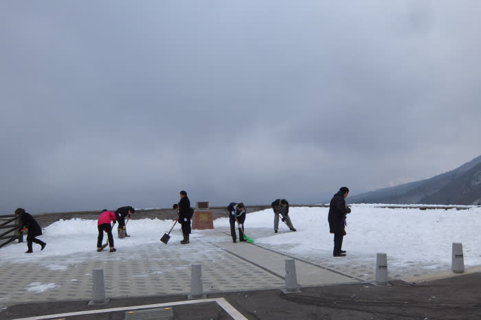 展望台では那須高原の観光施設関連の方達がスコップを手に除雪作業中。