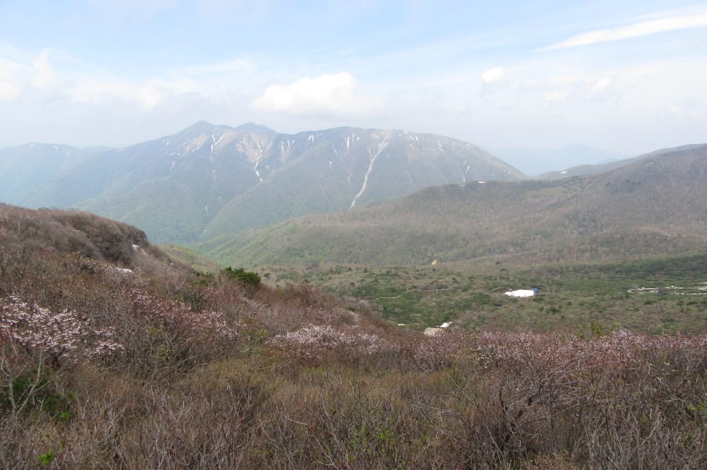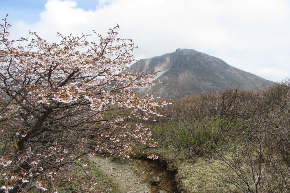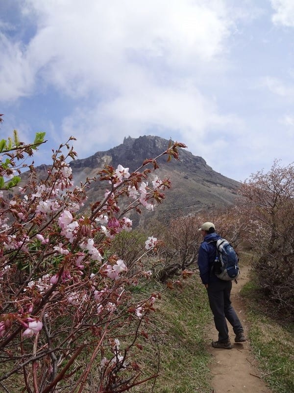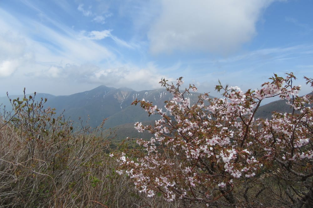 前方に満開のミネザクラに彩られる牛ヶ首からの尾根と雄大な茶臼岳。
