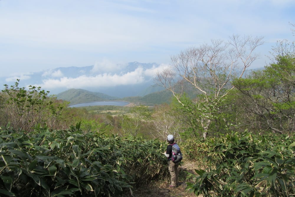展望が開けたところから振り返って、沼原調整池と大佐飛山など男鹿山塊の雄大な景色。