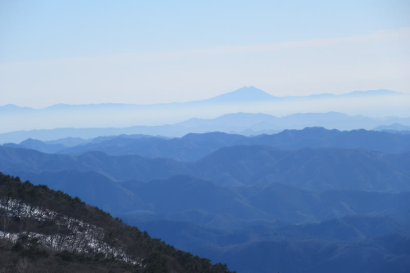 青のグラデーション、連なる山の向こうに筑波山。