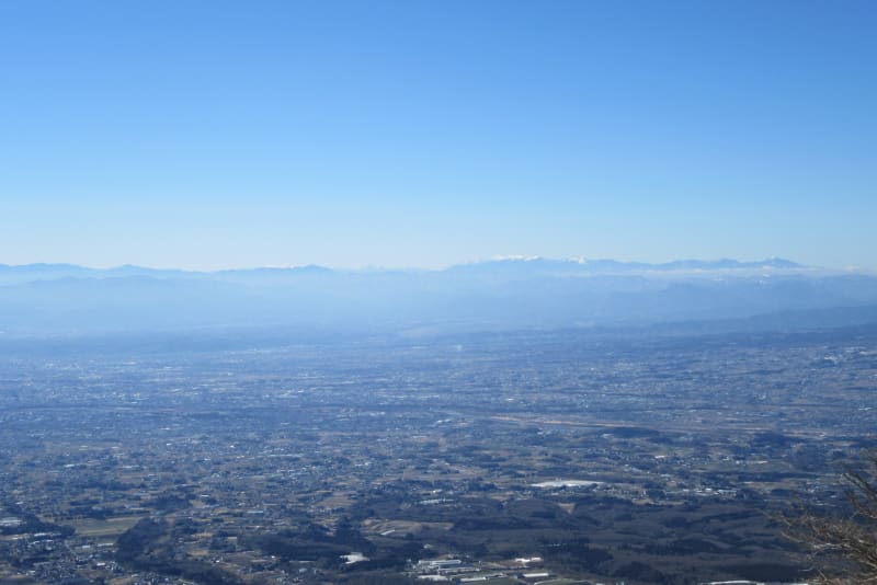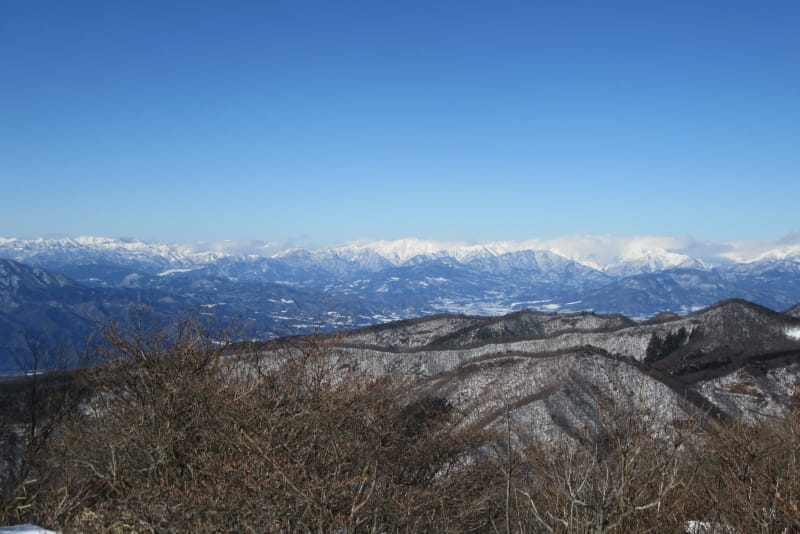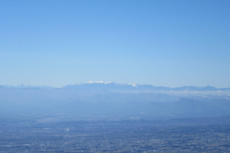 白い浅間山の右に北アルプス、草津白根山~志賀高原。浅間山の手前は榛名山か?