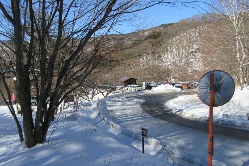 尚、駐車場までの路面は日陰で凍結。駐車場もツルツルなので最初からアイゼンを装着してスタート。