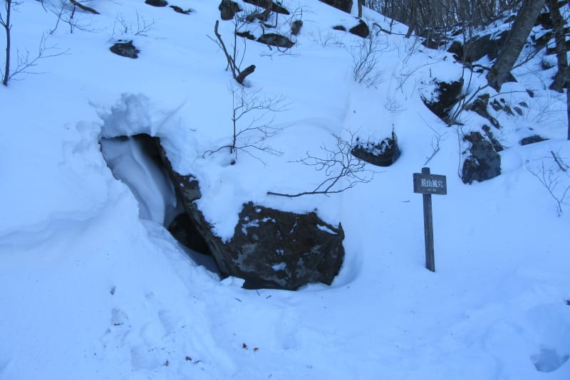 寒々とした薄暗い森の中を歩く事小1時間で荒山風穴へ。