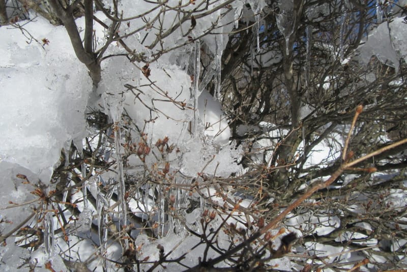 木々の枝に積もった雪が融けてキラキラの氷柱となり・・・。