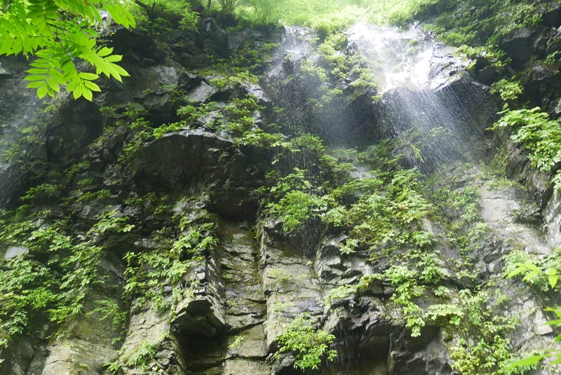 厳冬期にはトゲトゲの氷柱がぶら下がる絶壁ですが、今は天然のシャワーとなって降り注いでいます。