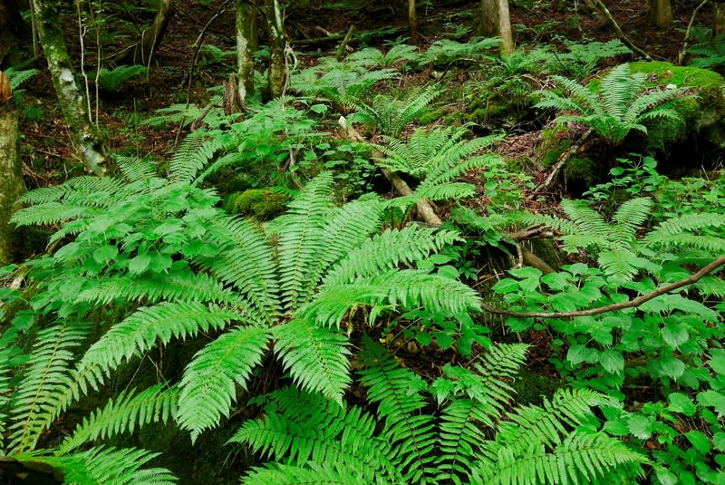 歩道沿いの森には大きなシダが生い茂っていました。