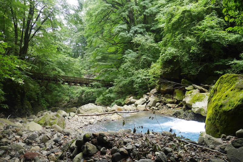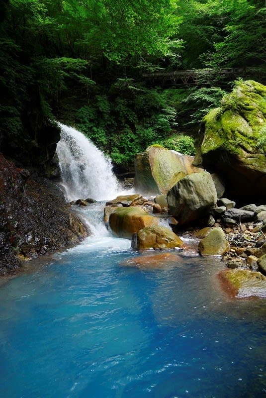那須塩原市側の雄飛の滝歩道線を歩いて美しいスッカンブルーの渓谷と名瀑を観賞します。