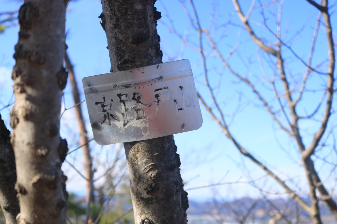 こちらも道標は無く踏み跡のみ。山名板は高い木の上に括り付けられていた。