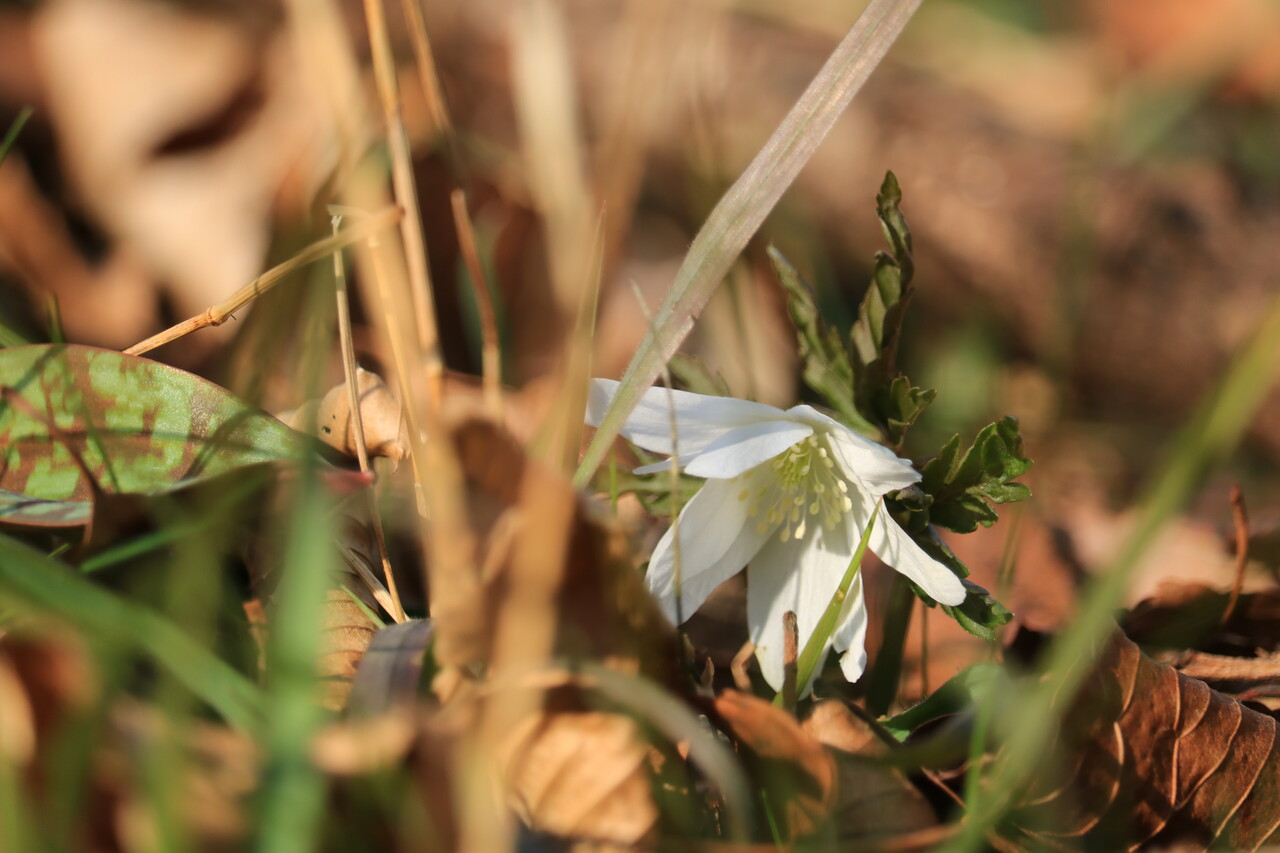 まだ早春の花々には早過ぎたが、日当たりの良い林の中でキクザキイチゲがお目覚め。