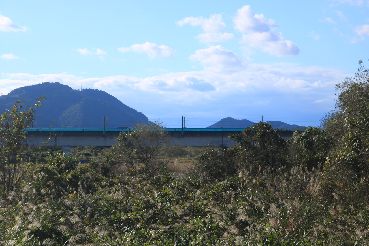 鬼怒川に架かる新幹線高架橋と背景に羽黒山。