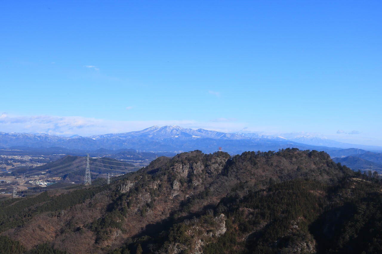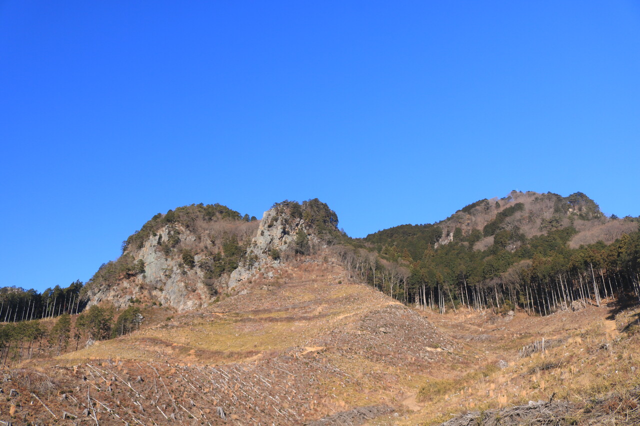 伐採跡地から望む古賀志山と獅子落としの岩峰。