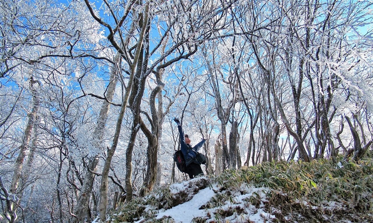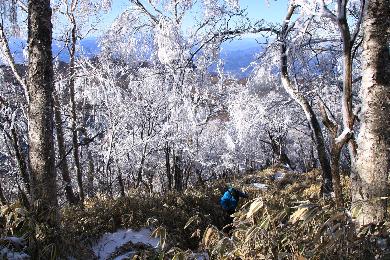 駒ヶ岳へ向けて霧氷の森を駆け下りる。