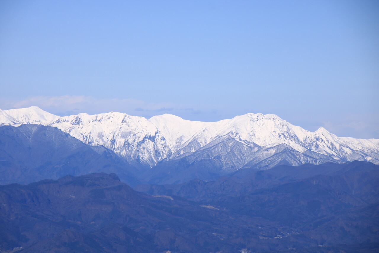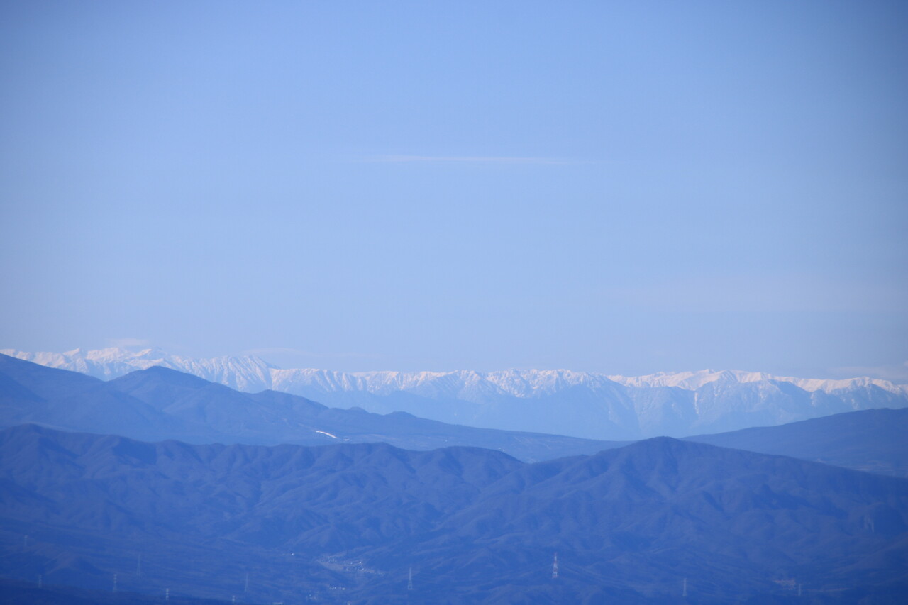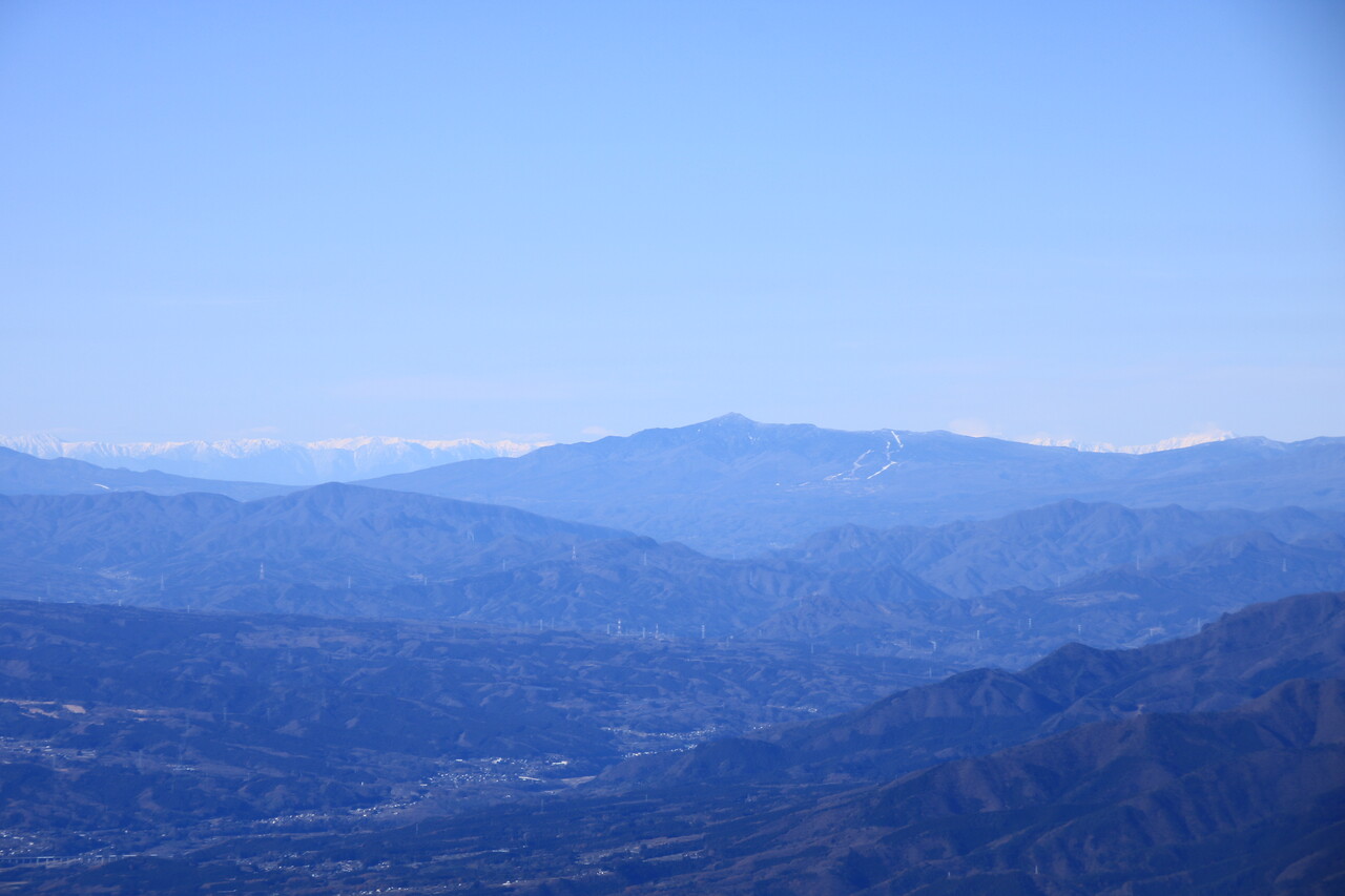 四阿山の後方に北アルプスの白屏風。