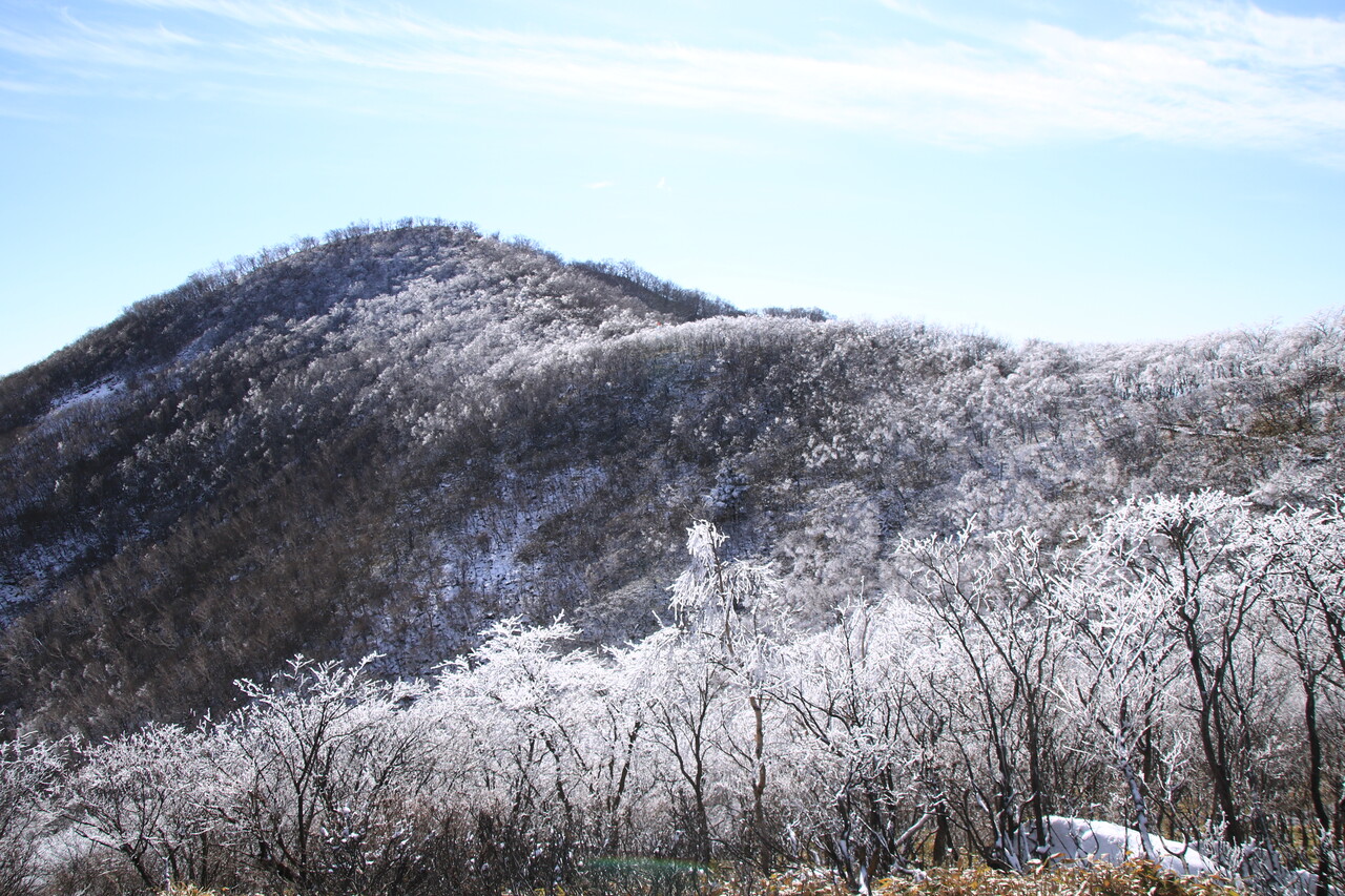黒檜山の山頂部は霧氷に覆われて真っ白。