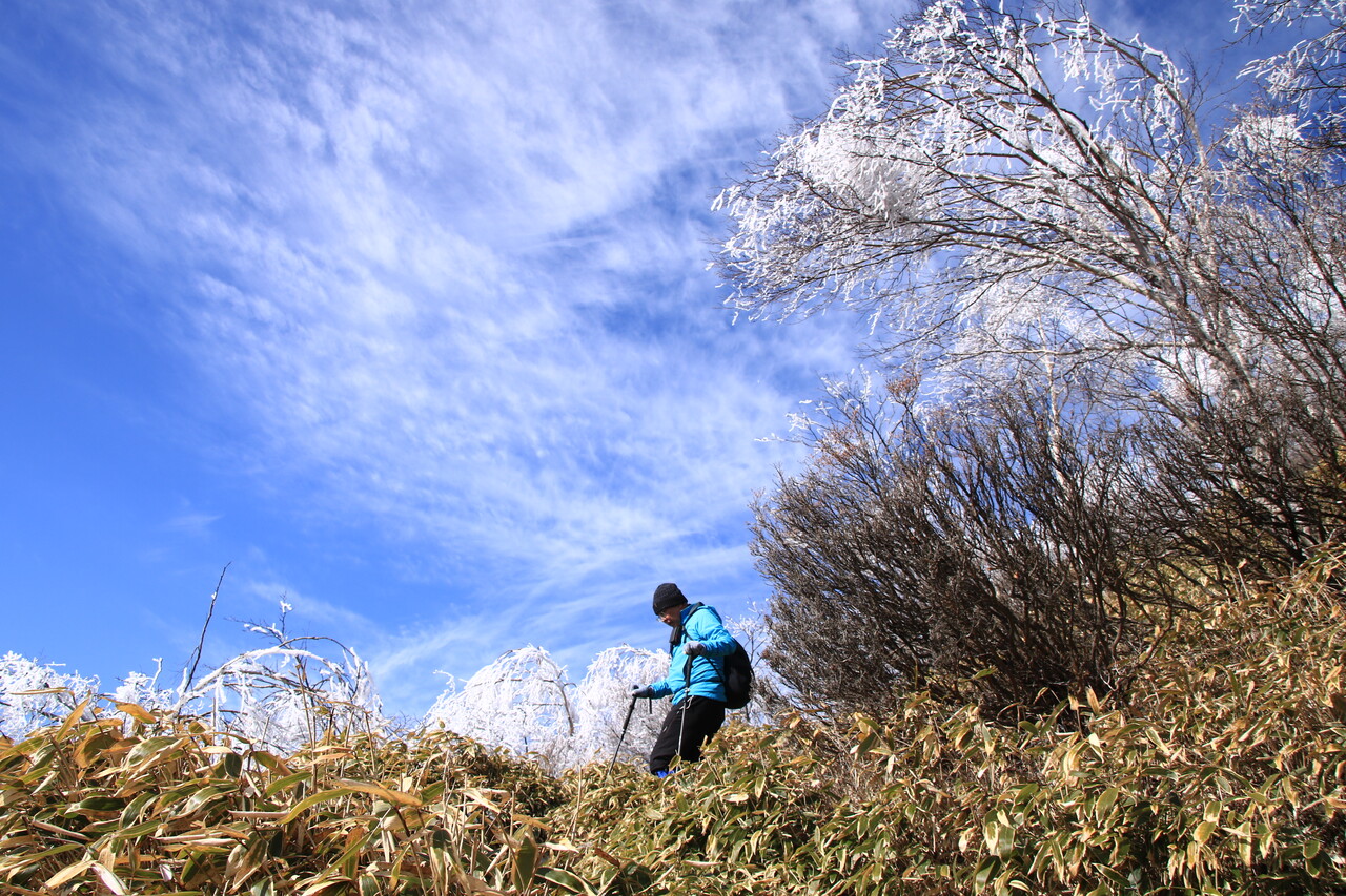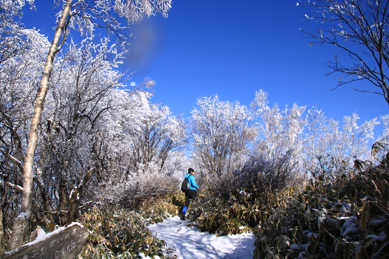 青空んもと霧氷と展望を楽しみながら、気持ち良く歩け