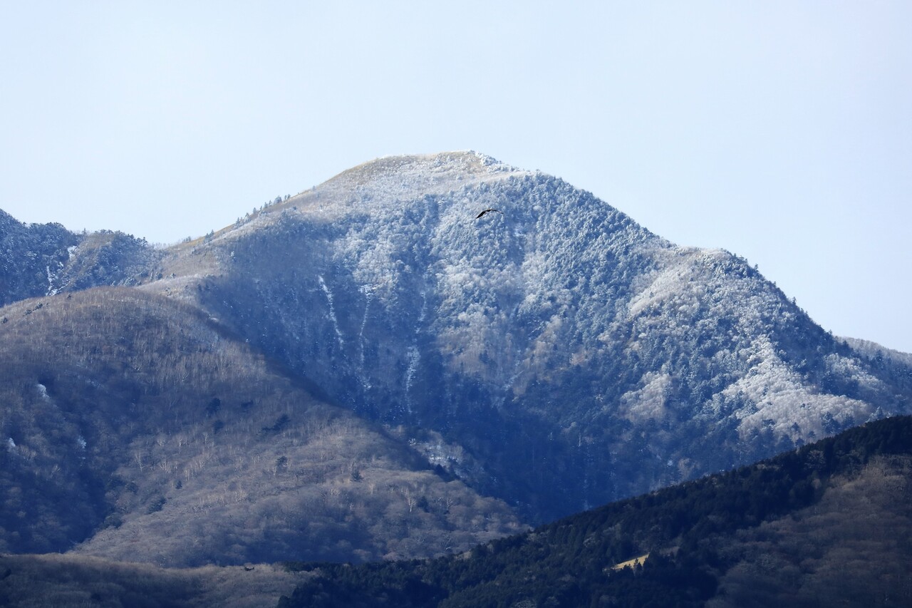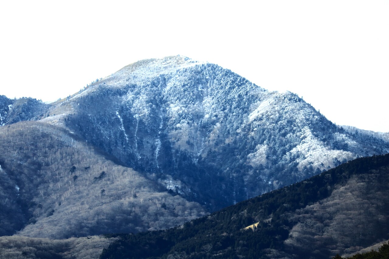 ならばと、県民の森へ行く途中の寺山ダムサイトから望む釈迦ヶ岳を撮影。