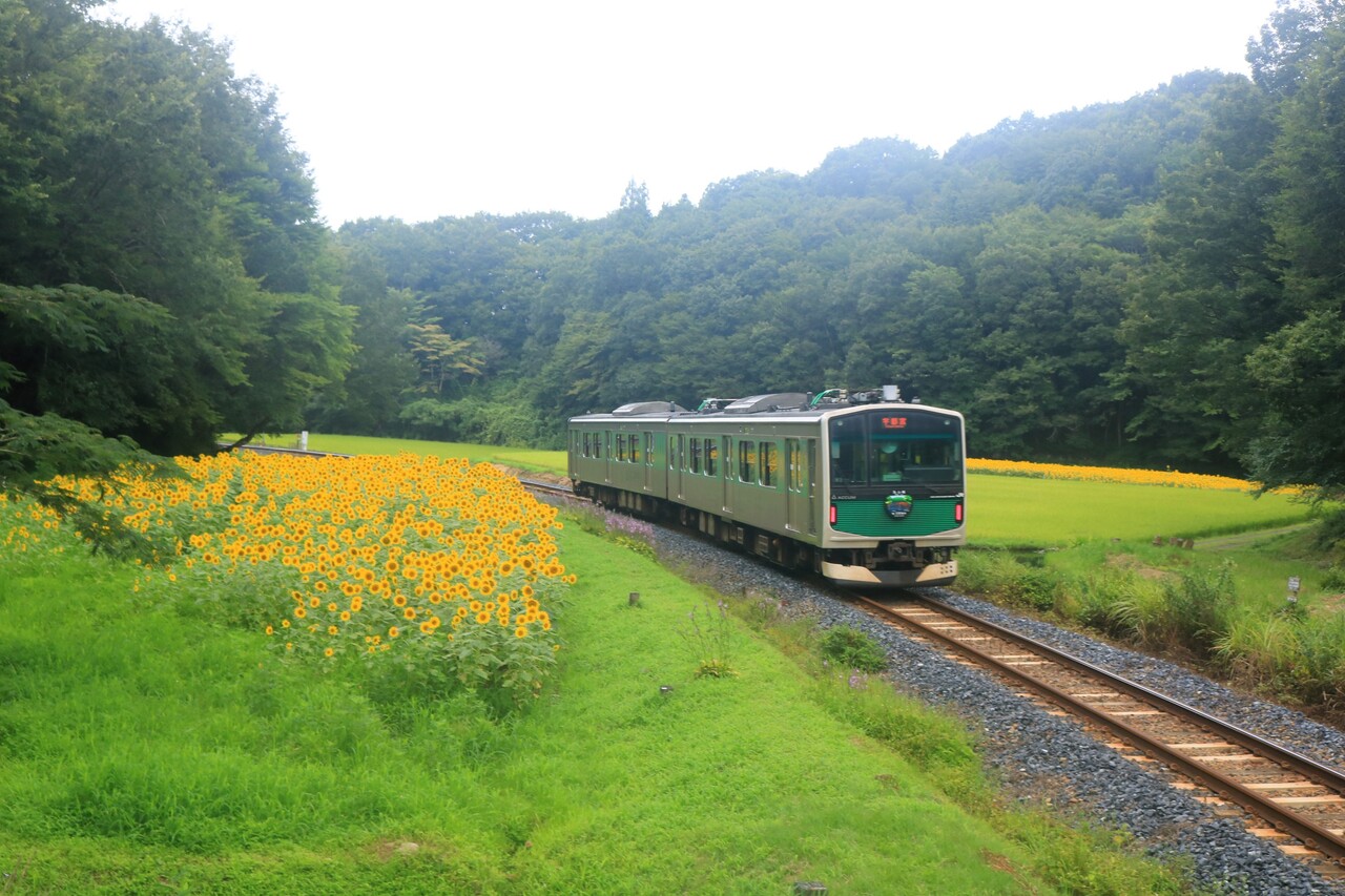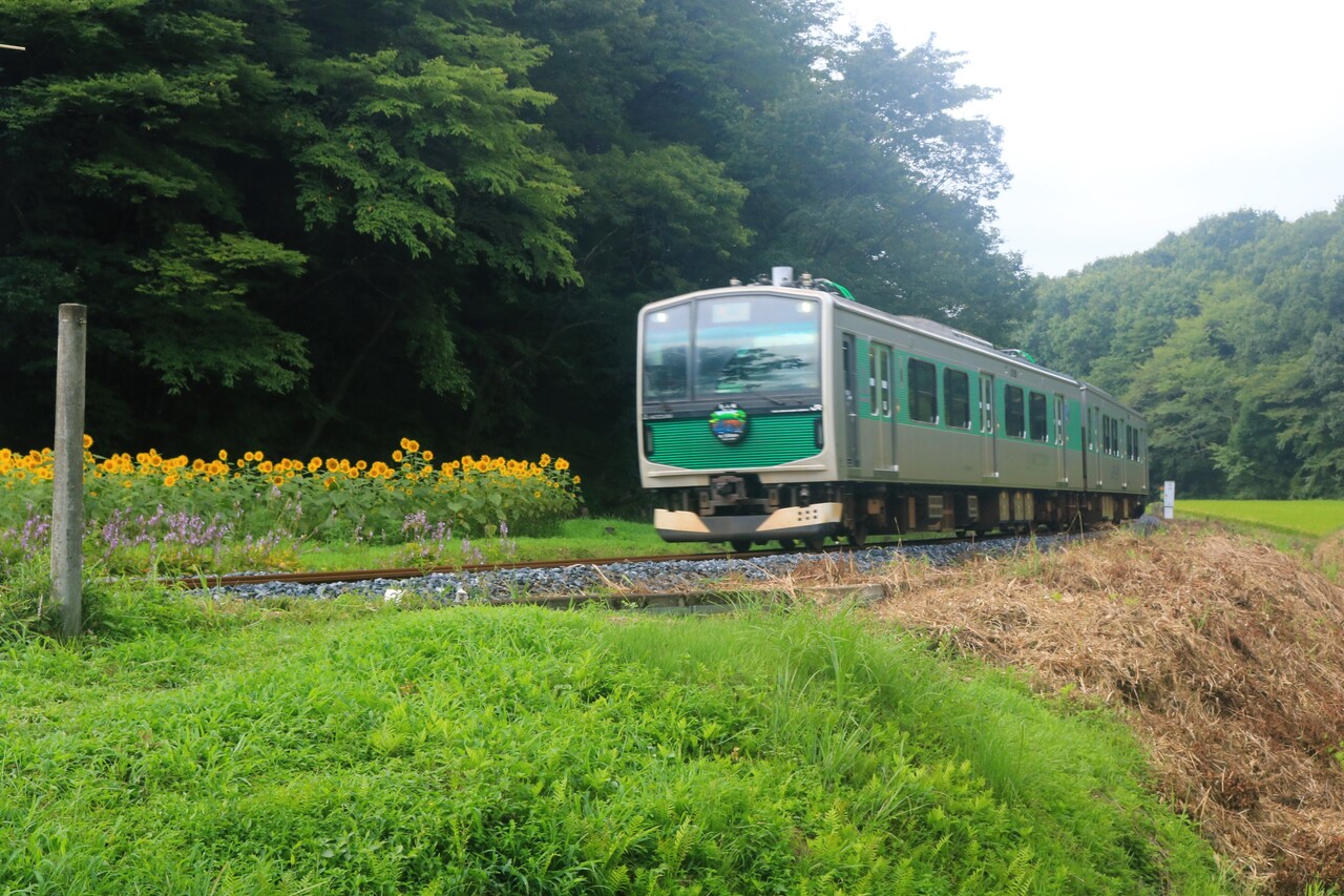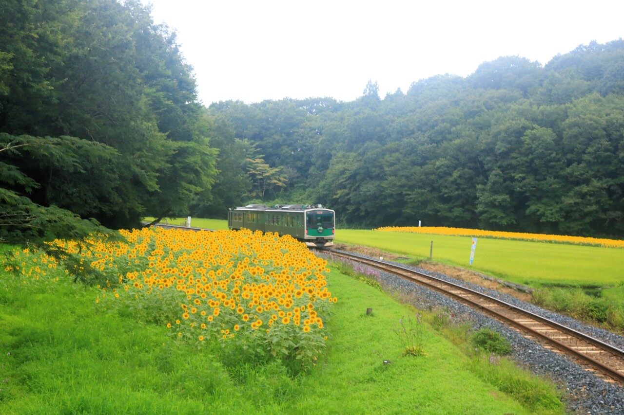 JR烏山線小塙駅周辺の田んぼや畑で8万本の向日葵が咲き誇り、蓄電池駆動電車アキュムとの競演が楽しめるとの情報。
