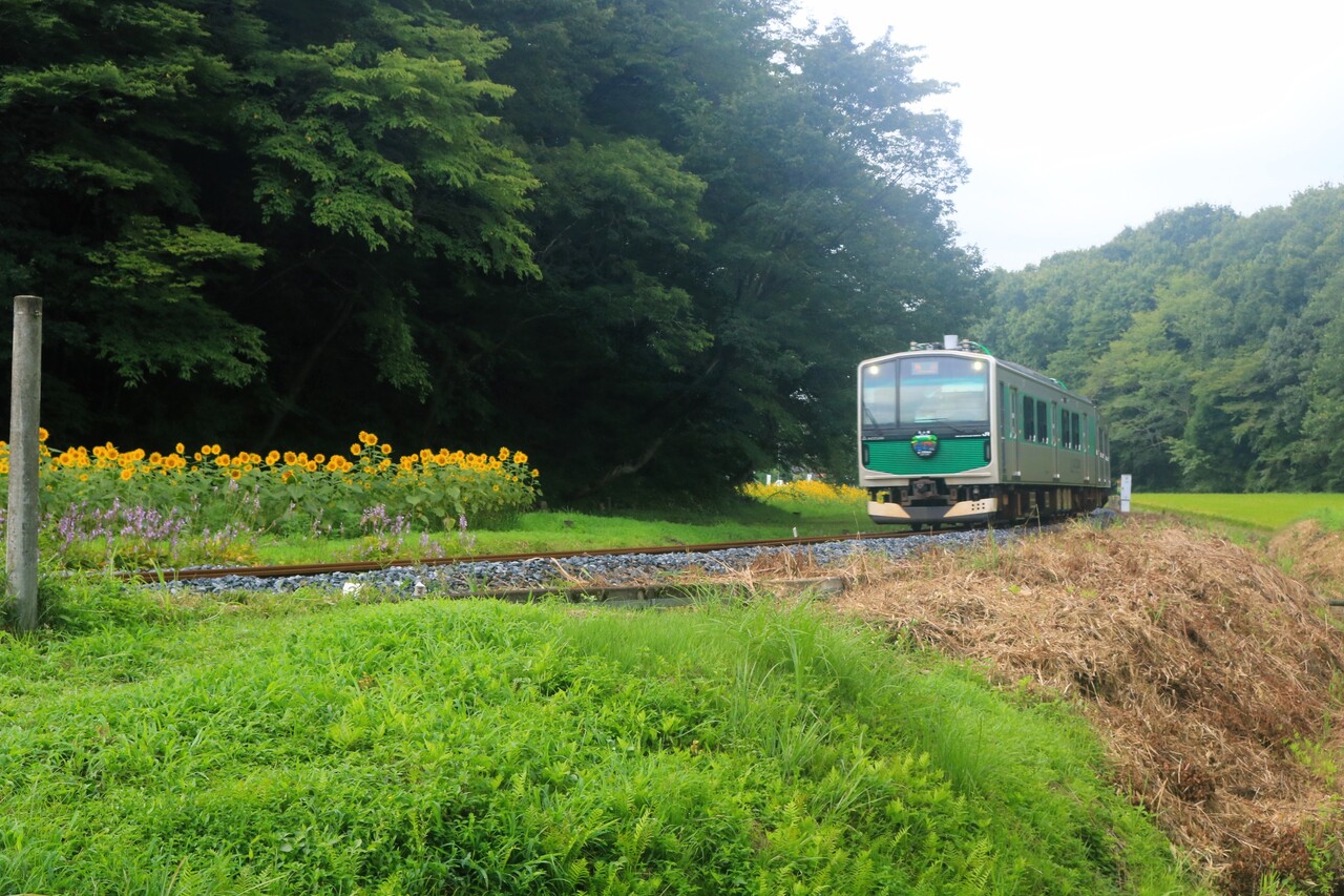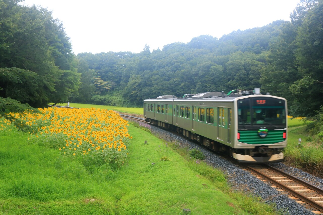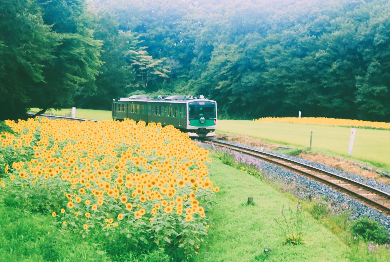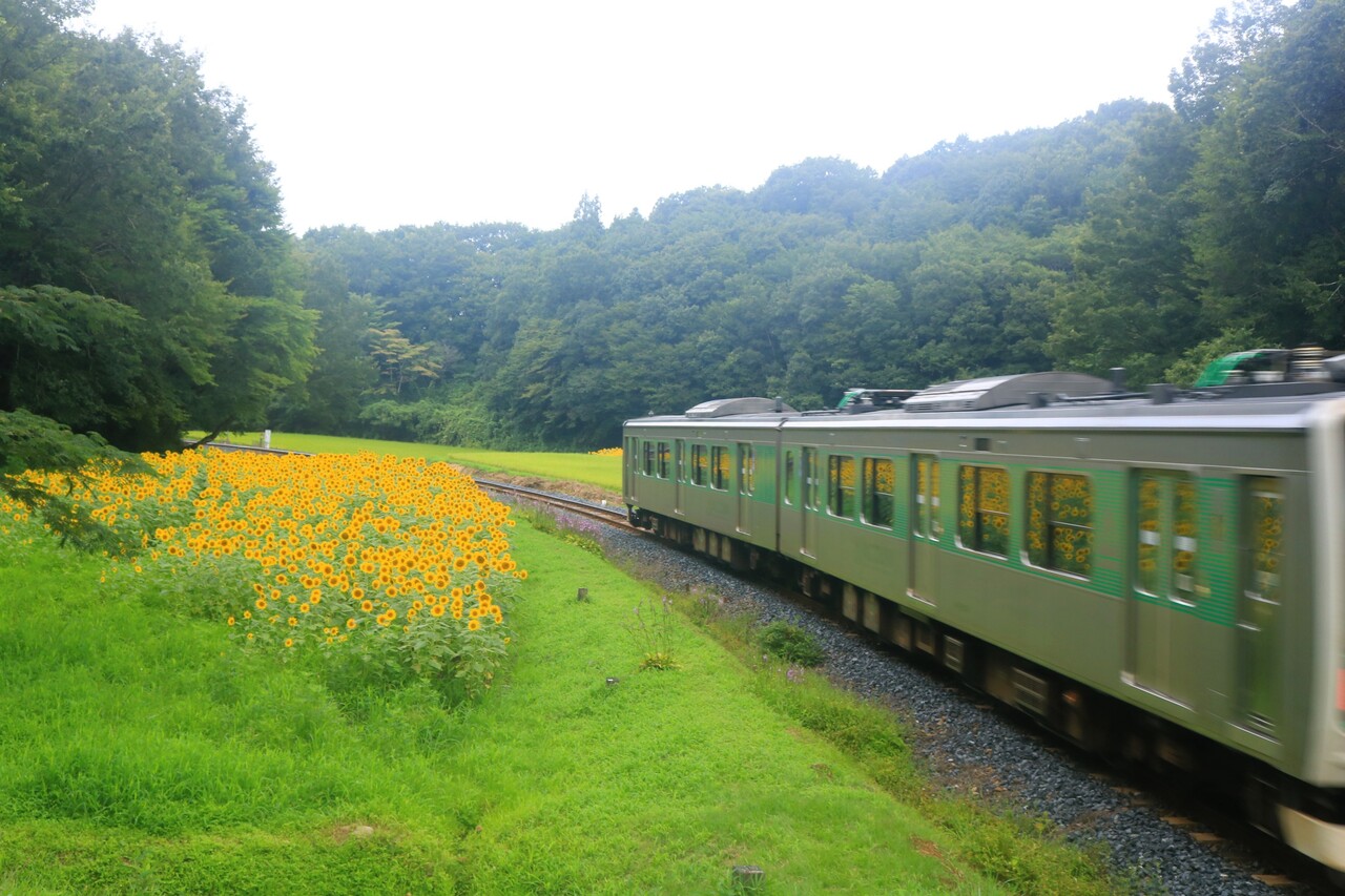 JR烏山線小塙駅周辺の田んぼや畑で8万本の向日葵が咲き誇り、蓄電池駆動電車アキュムとの競演が楽しめるとの情報。