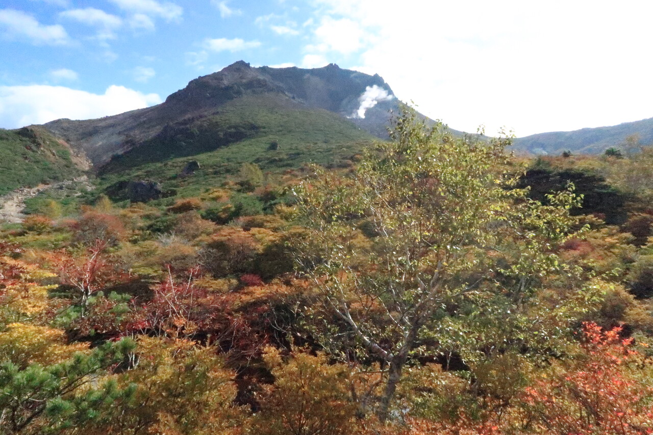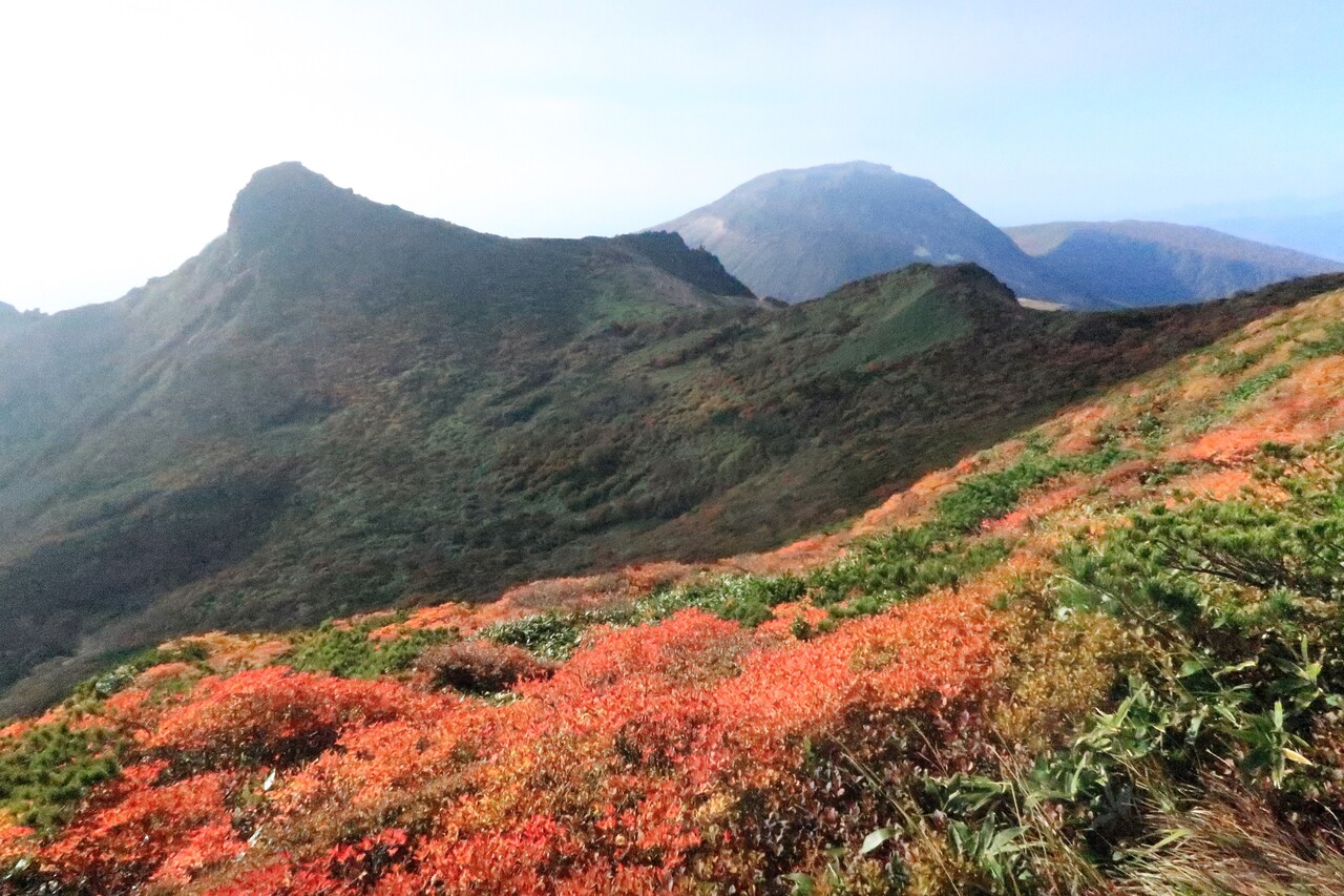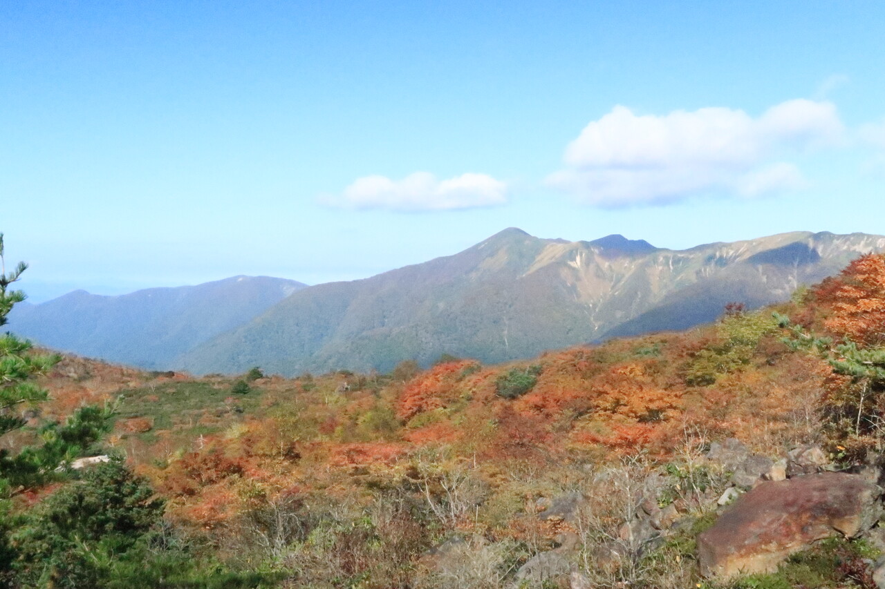 紅葉の絨毯越しに朝日岳~茶臼岳~日ノ出平。