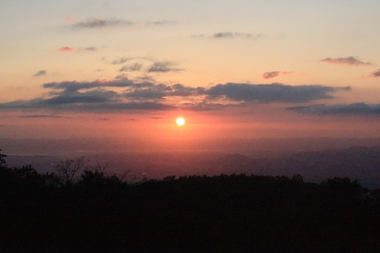 午前5時45分、峠の茶屋駐車場で日の出を迎える。