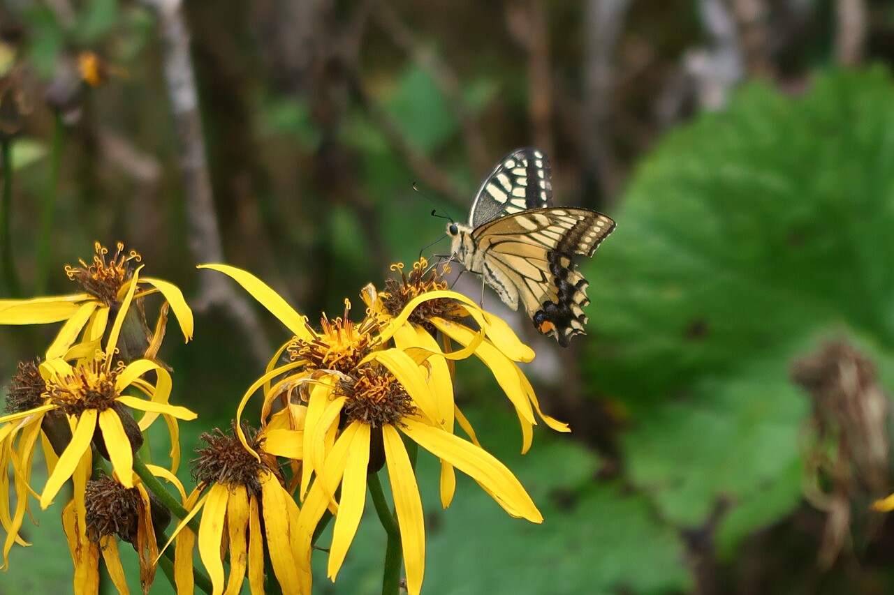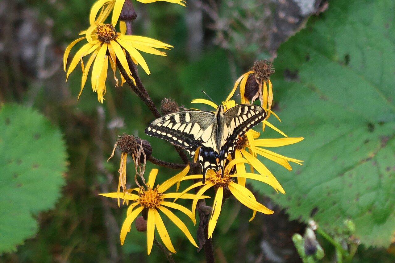 マルバダケブキを吸密するキアゲハ。