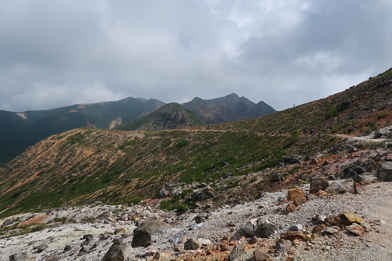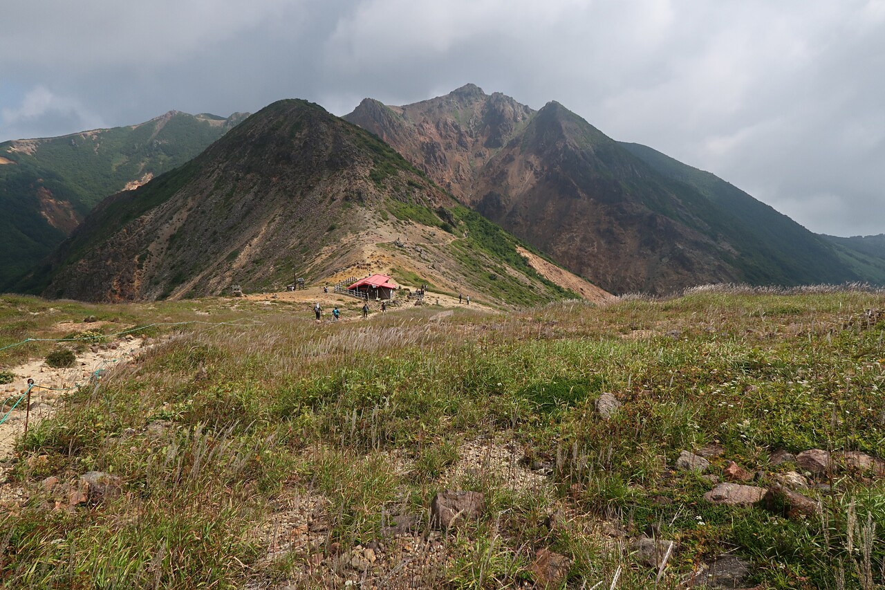 曇天でも眺望はまずまず。 峰の茶屋跡避難小屋~剣ヶ峰~朝日岳、後方に三本槍岳。