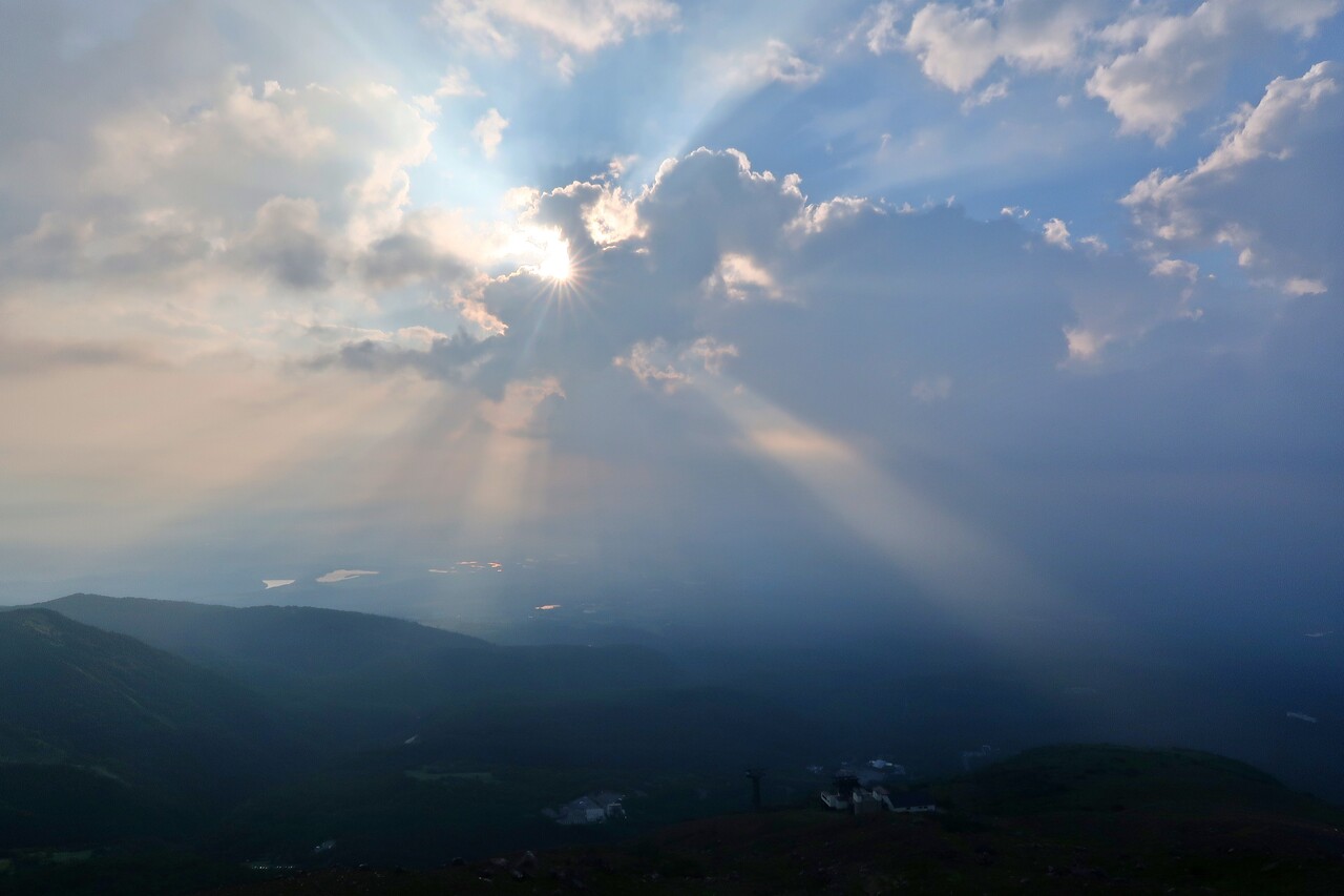 下山はロープウェイ山頂駅方面へ。 すると日の出の時刻から約1時間遅く雲の間から日が射して来た。