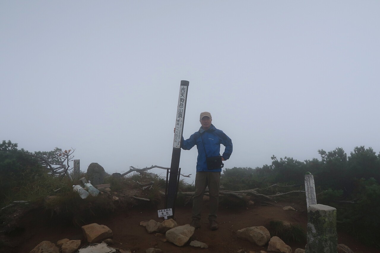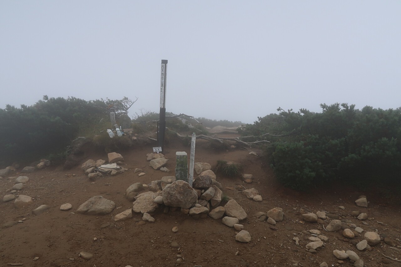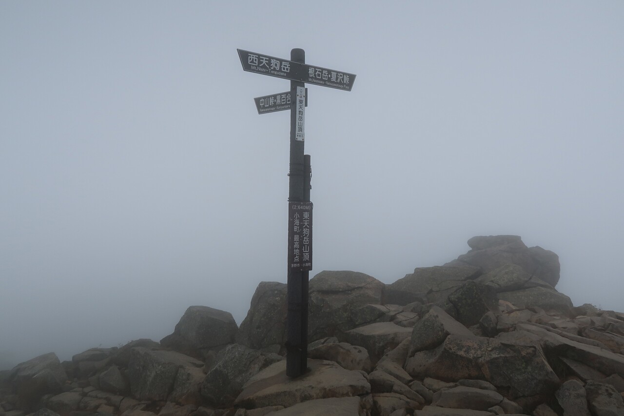 程なくして東天狗岳(2,640m)に到着🙌 だけど、ガスと強風は益々強くなるばかり。間違いなく風速10m/sは超えてるな。 第一展望台辺りで撤退した人が居たらしいが、その判断は間違いなかったかも?😅