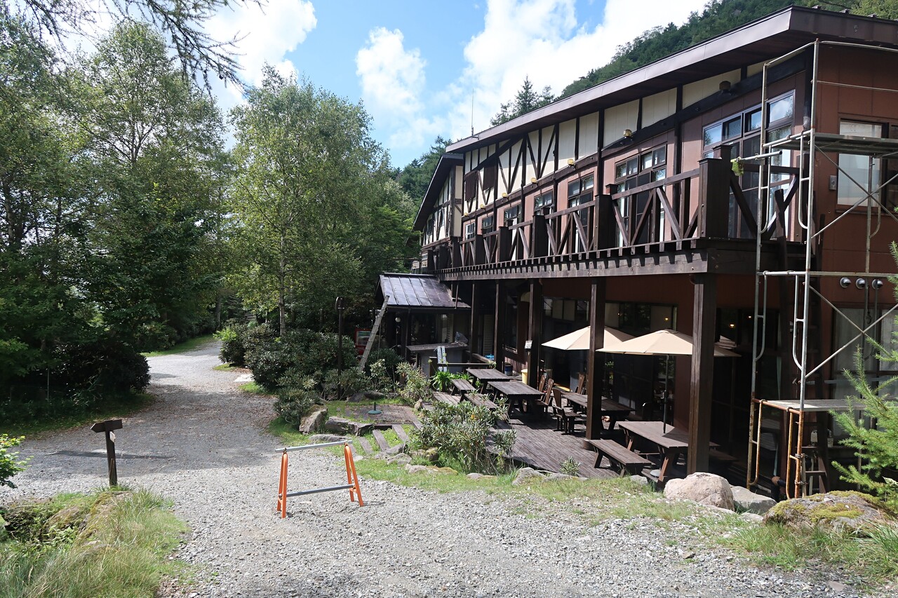 漸く出発地の唐沢鉱泉に無事ゴール。 展望は残念だったけど、ガスと強風の試練を乗り越え無事に登頂できた喜びは大きい。