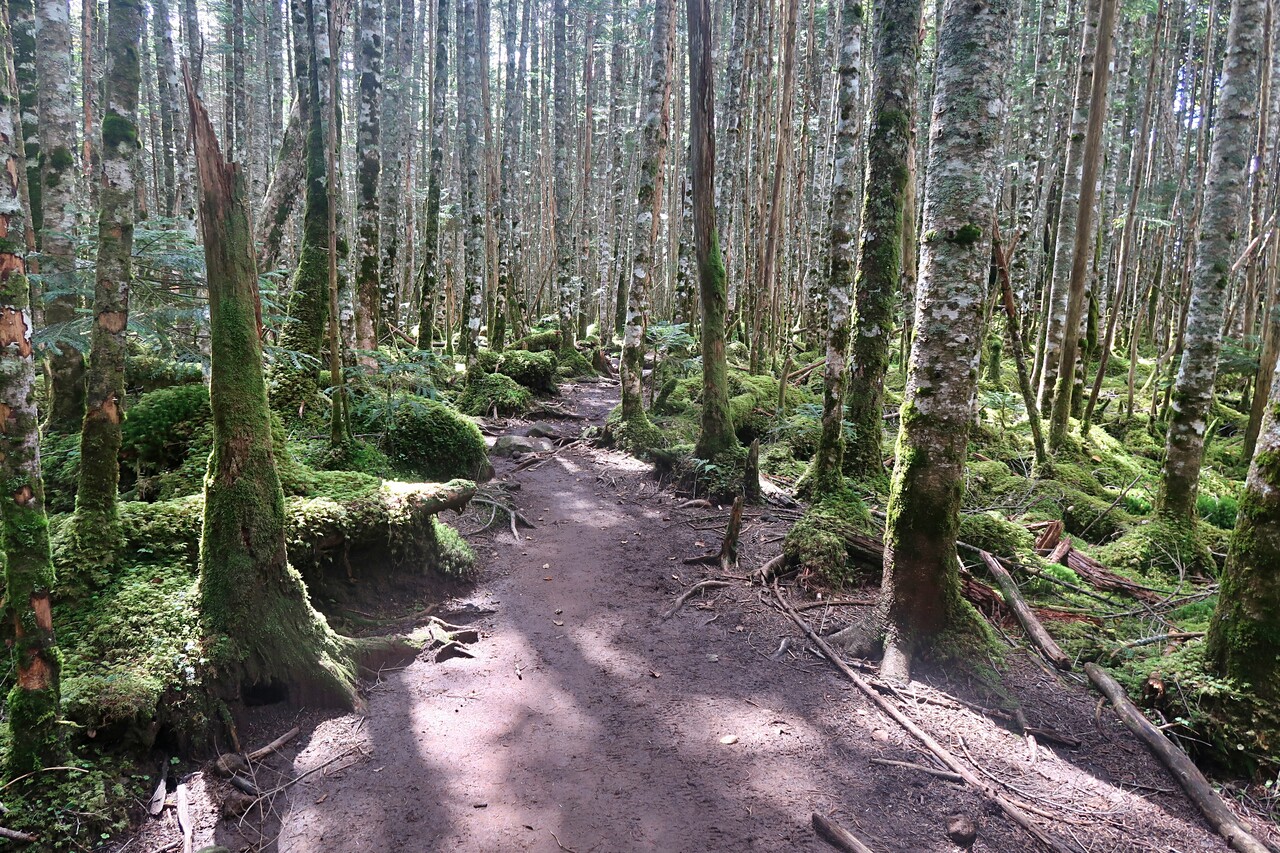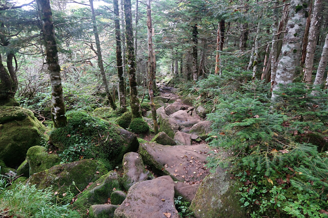 これがまた、とても滑り易くて厄介だった💦 湿った苔岩、木道、木の根っこ・・・足をズルッと取られること数回。 傾斜はそれ程きつくは無かったけど、最後まで気の抜けない下山路でした。