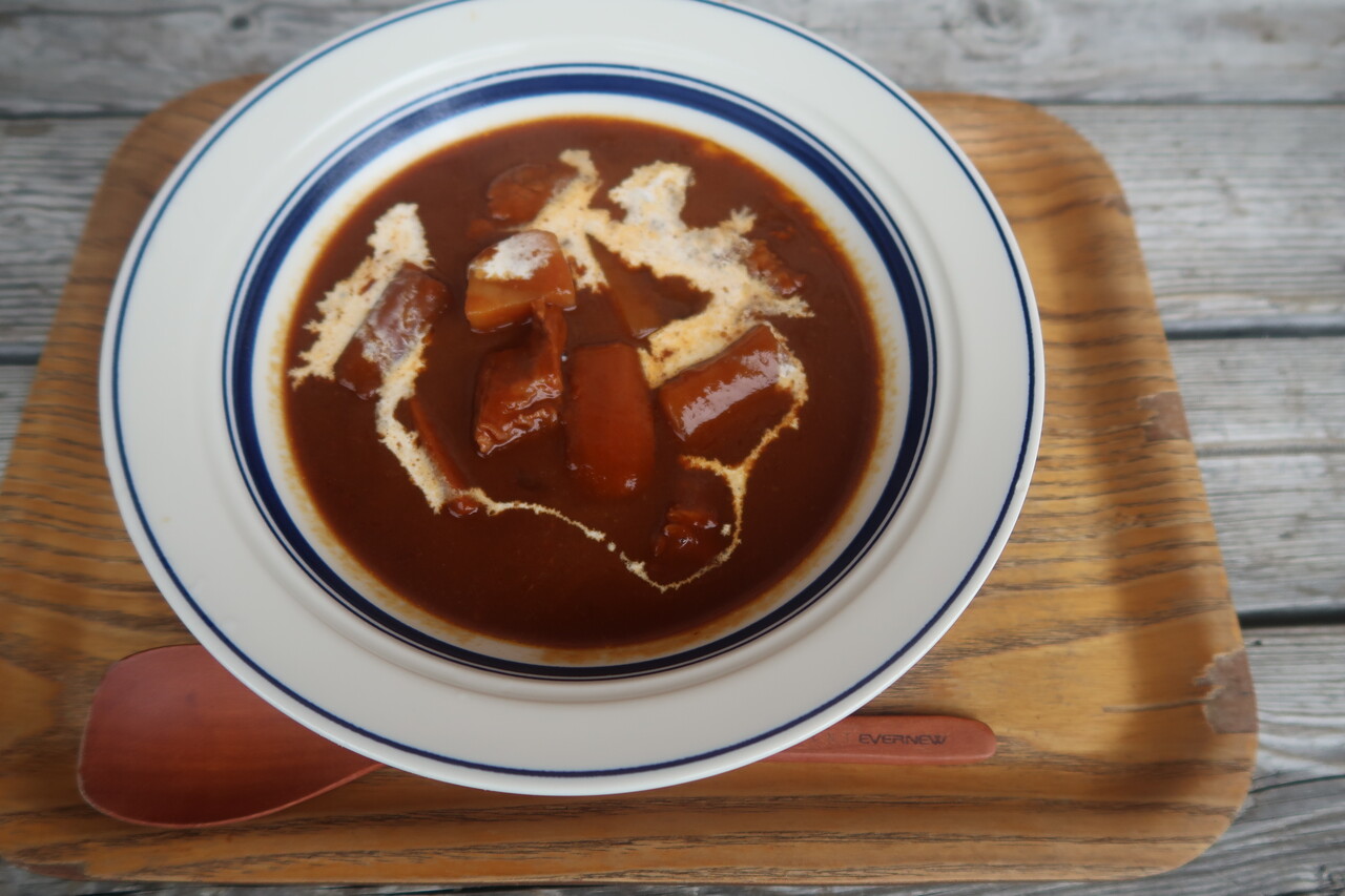 名物のビーフシチューを単品(1300円)でオーダー🍲 ありつけない場合のために買って来たコンビニパンと一緒に食す。 ビーフシチューは評判通りの絶品でした。