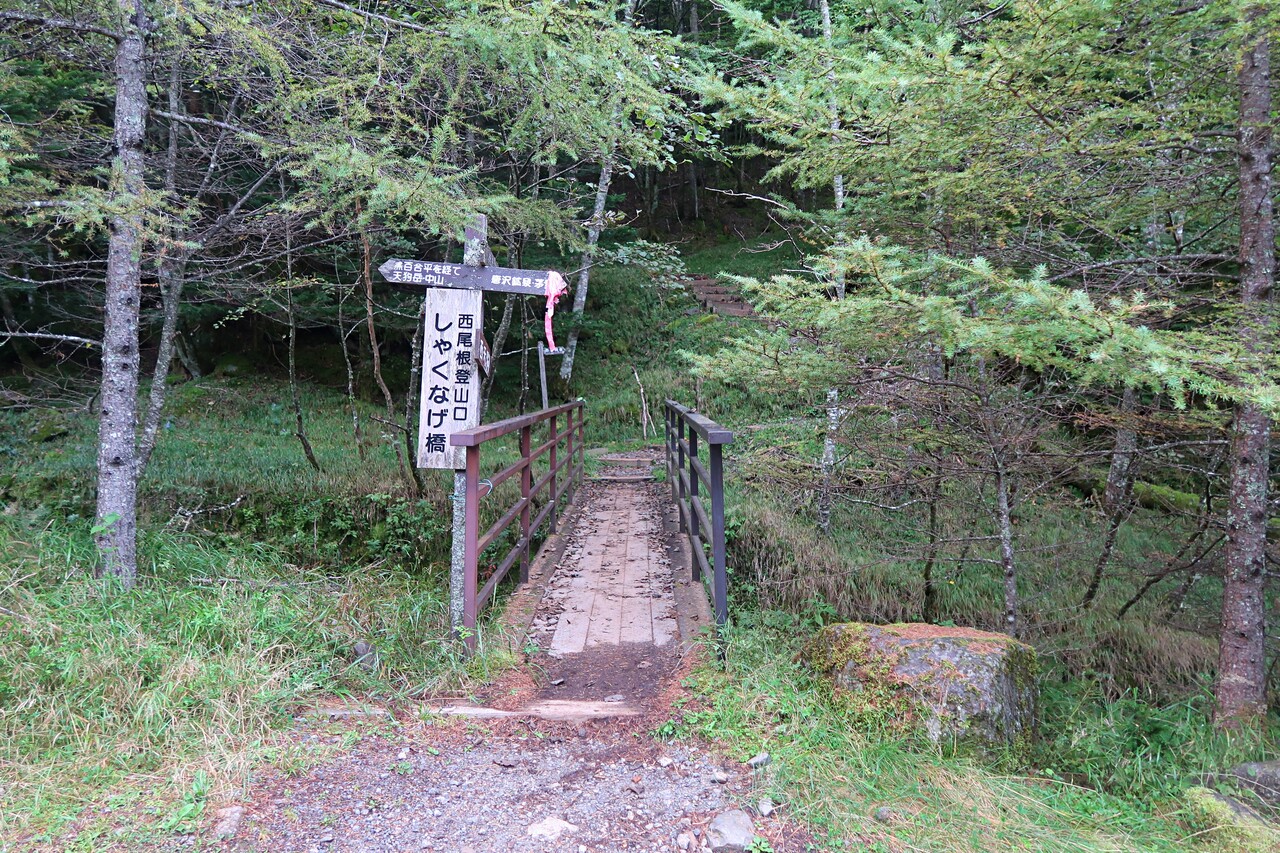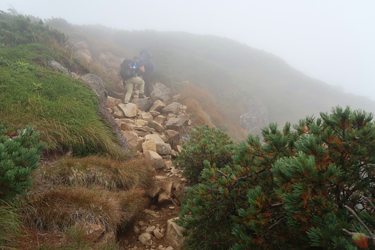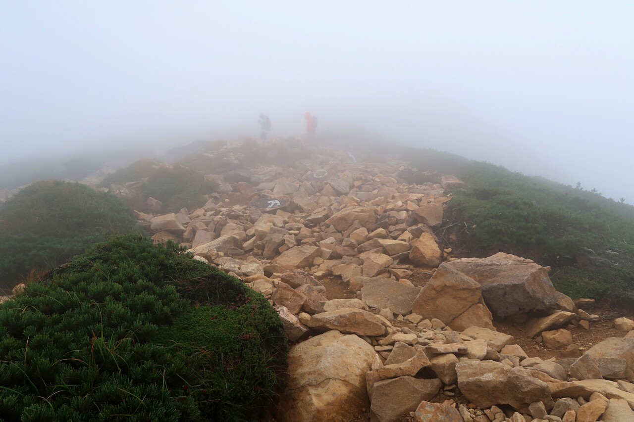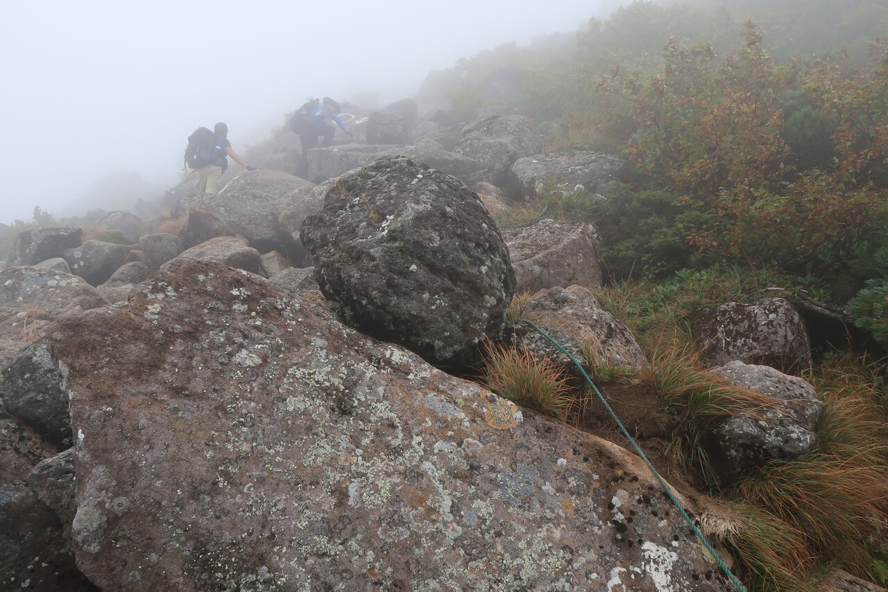 この辺りで山頂方面を振り返るも、相変わらずガスの中でその雄姿は拝めず。 予報通りに午後まで待てば天気が回復するのだろうか? だが、もう今の気分は眺望よりも黒百合ヒュッテのビーフシチュー😋