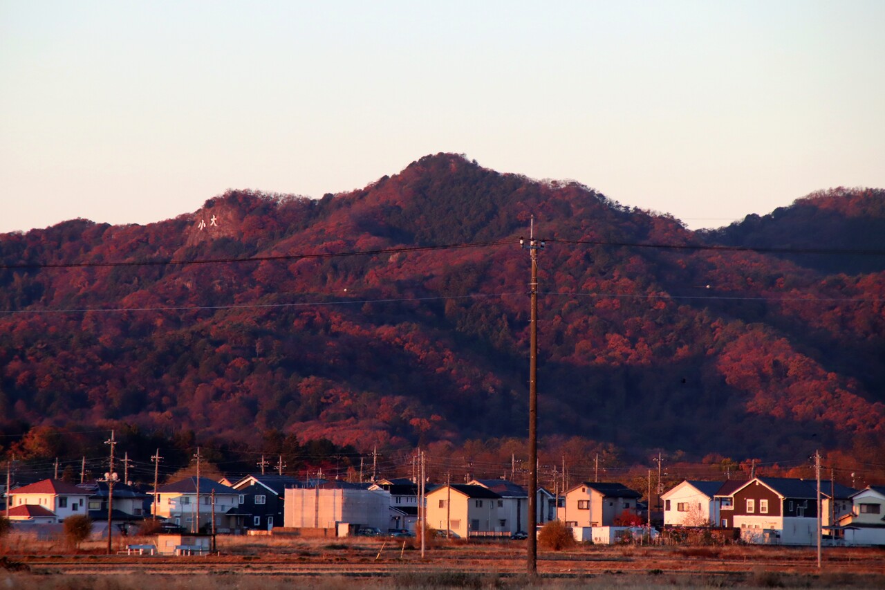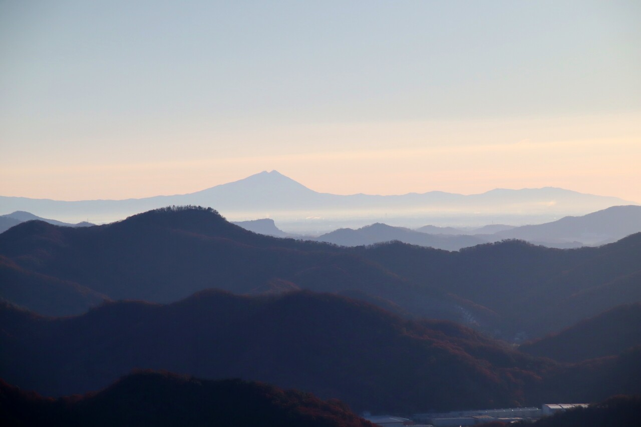 連なる山並みの向こうに存在感が際立つ筑波山。