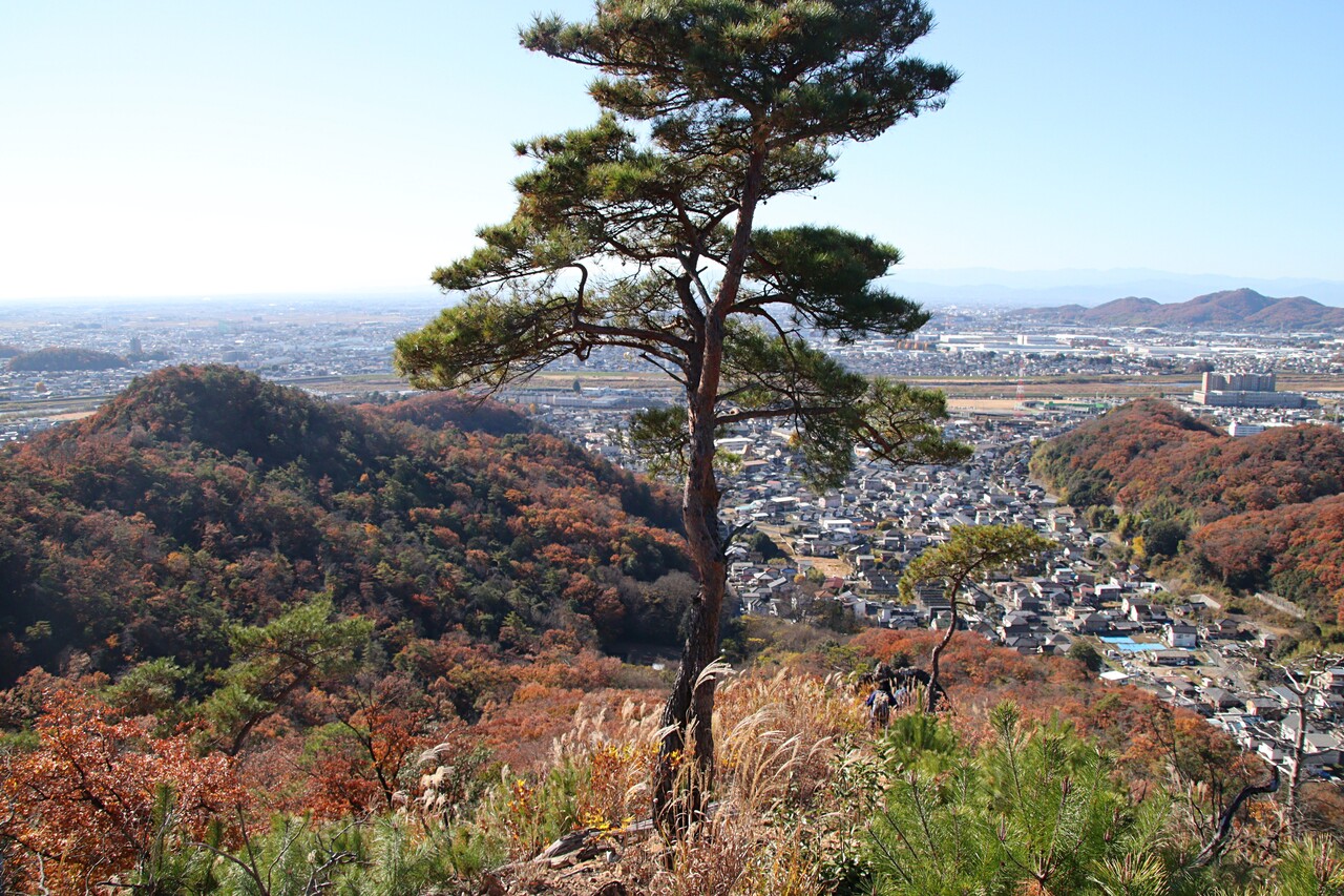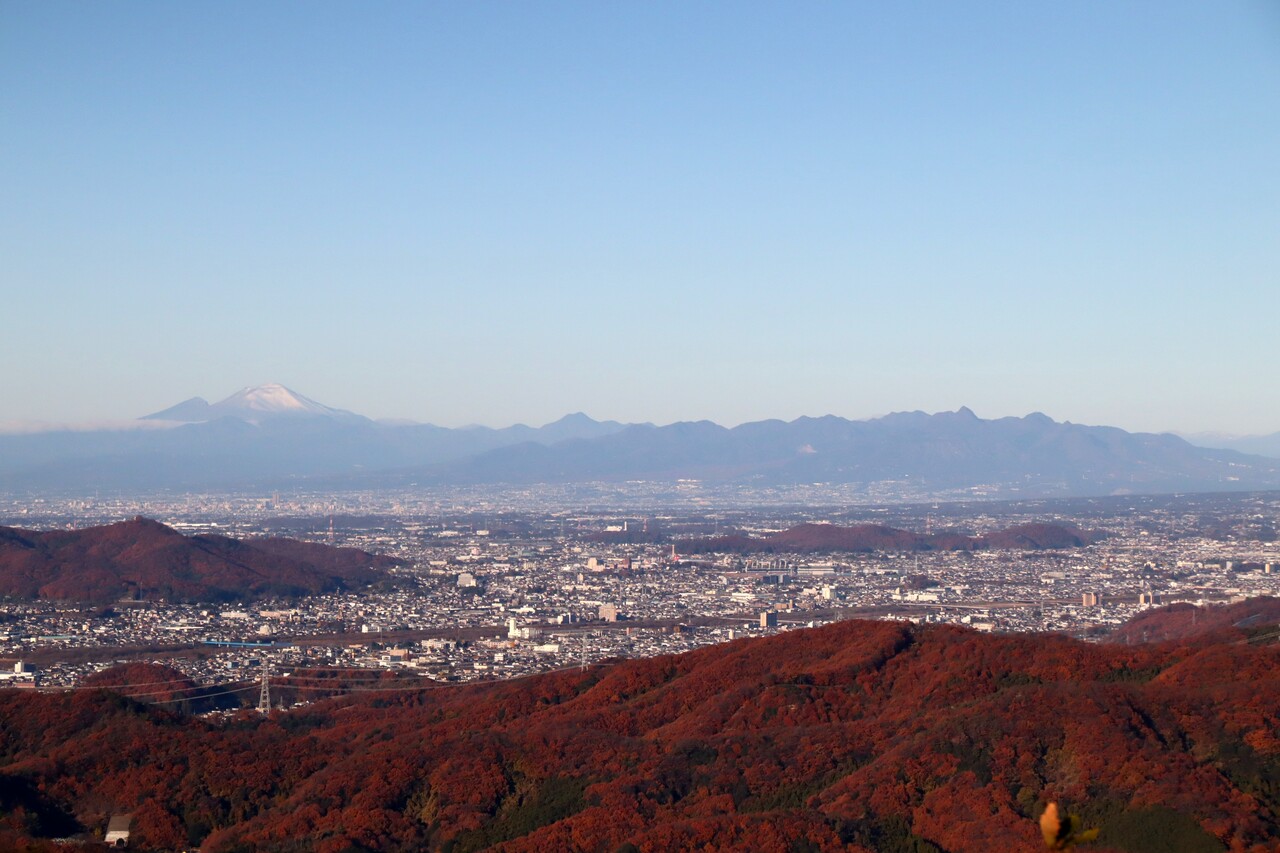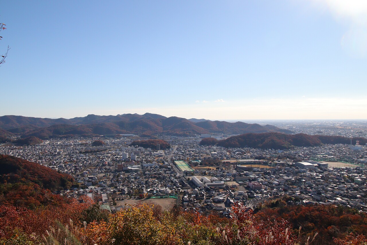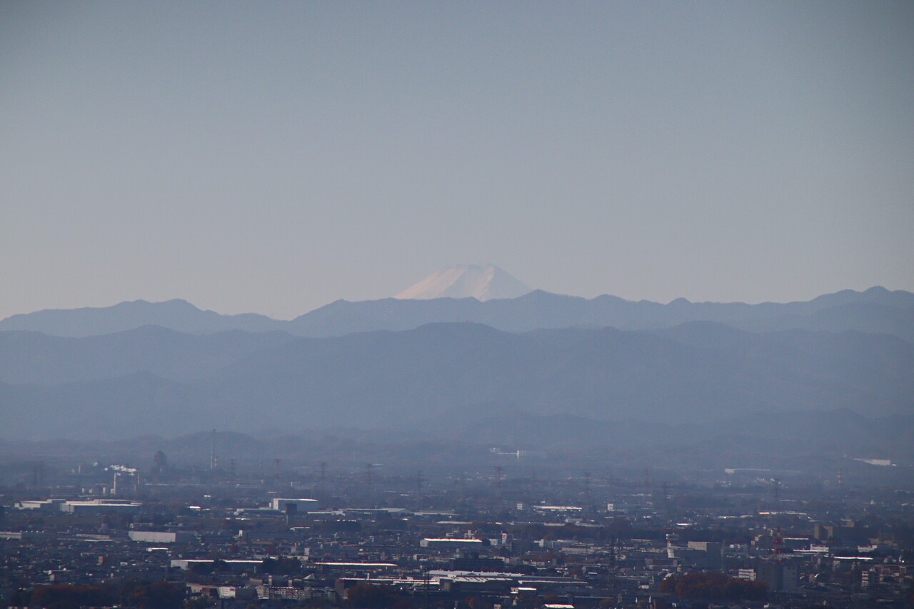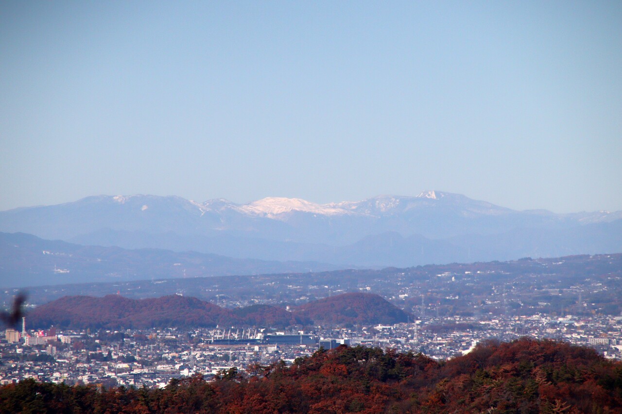 眼下に足利市~太田市の街並み、遠くに副都心のビル群やスカイツリーが望める。