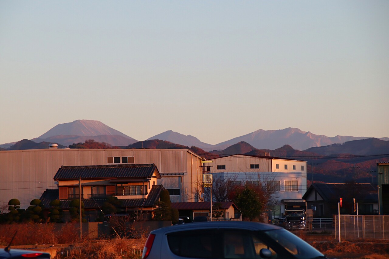 翌朝、マジックアワーの時刻に淡いピンク色に染まる空と富士山🗻 県南に来ると平地からでも普通に見えるんだね😄