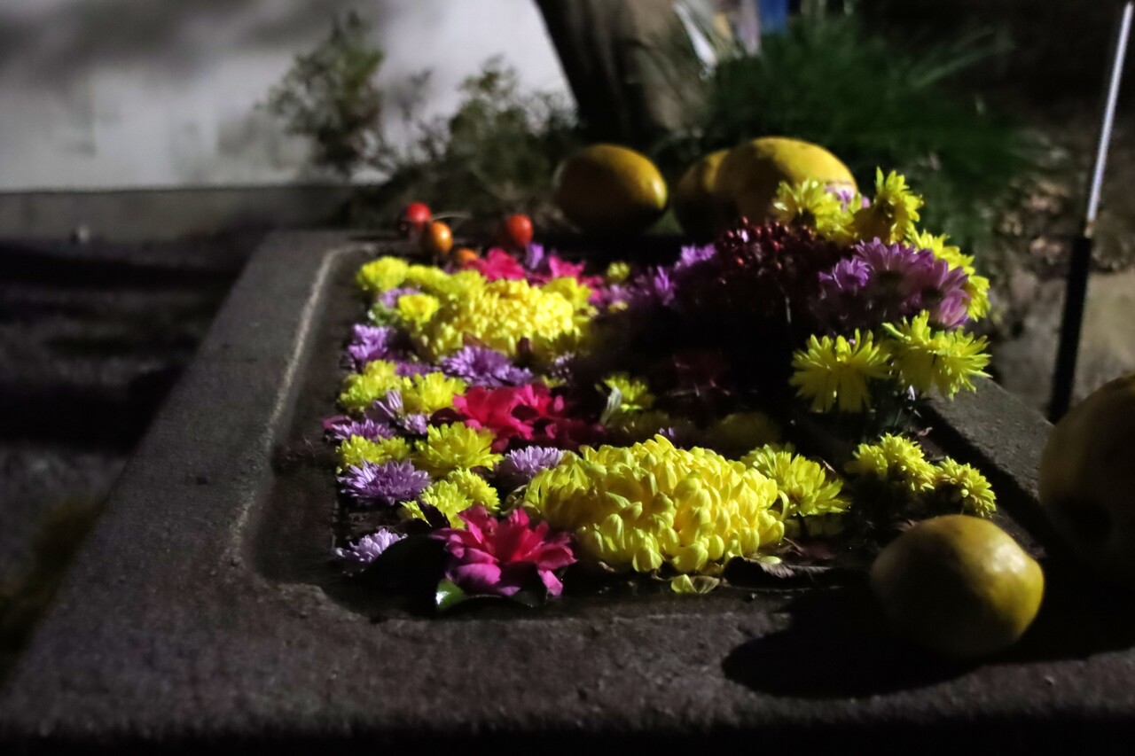 弁財天から降りて周辺を散策。 湧釜神社の花手水。