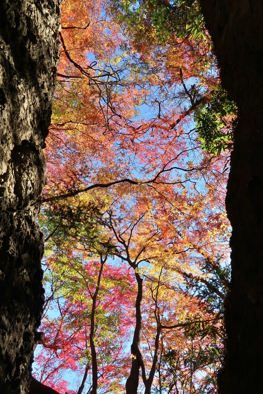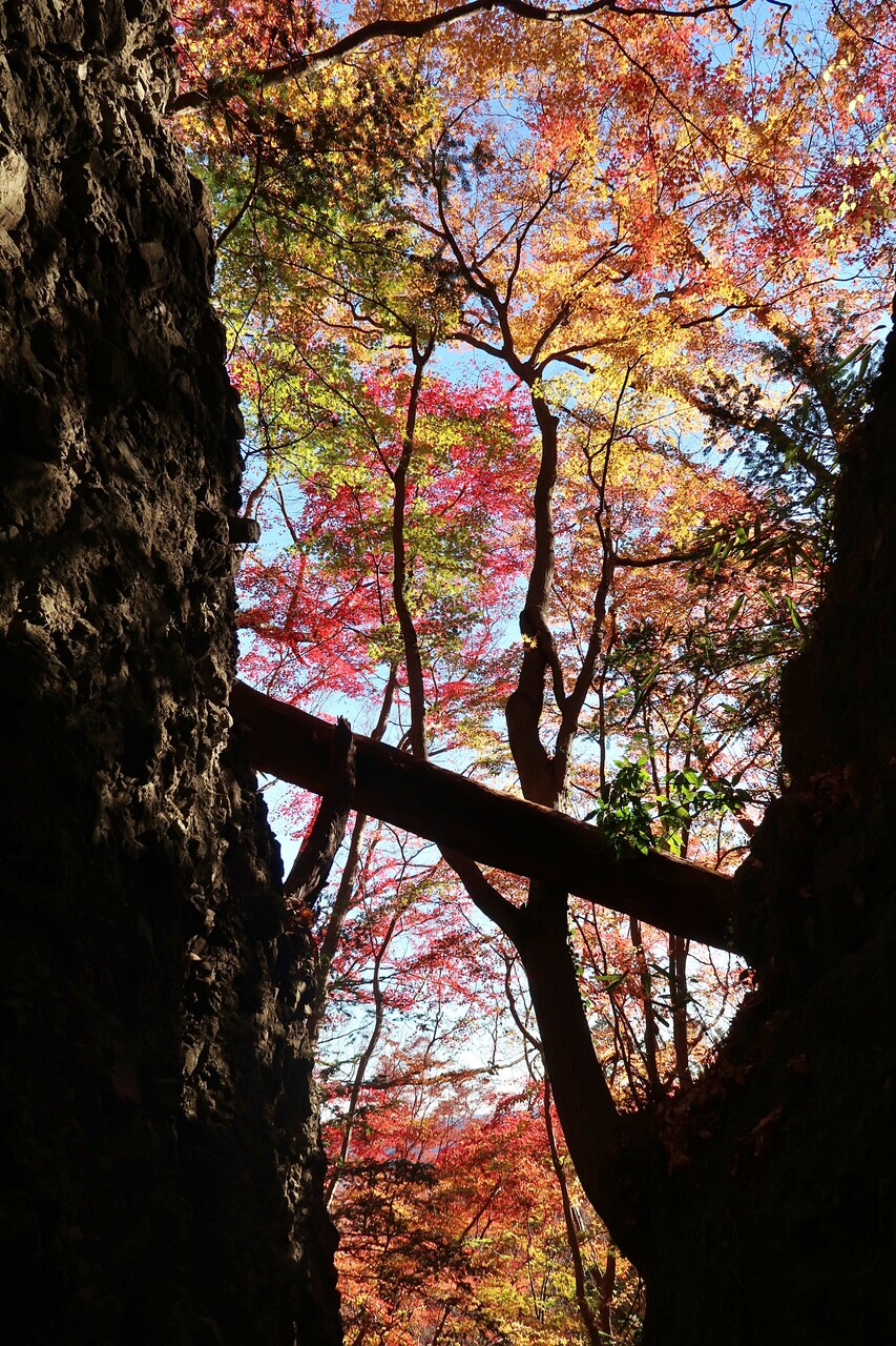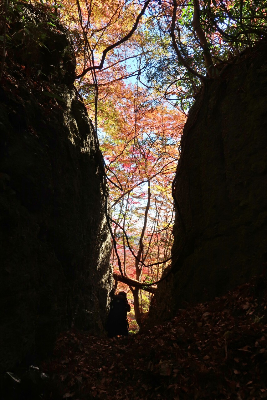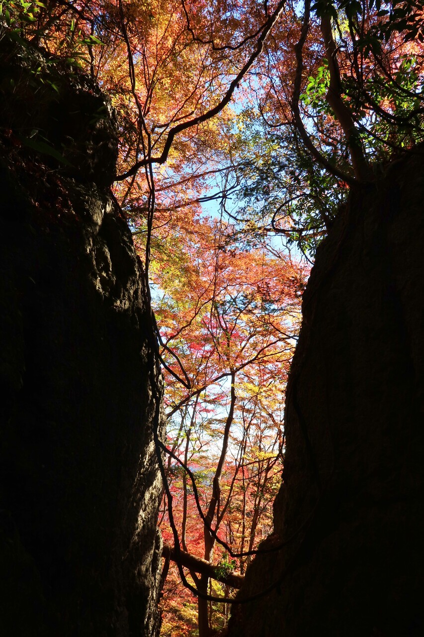 岩の割れ目越しに見る紅葉は絶景そのもの。