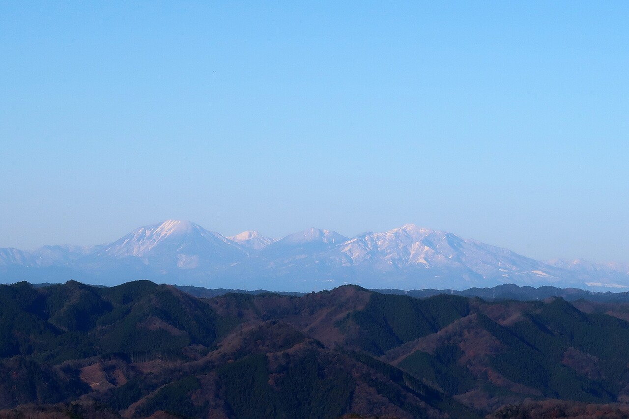 晴れ渡る冬空背景の白くなった高原山、那須連峰を眺めながら家路へ。