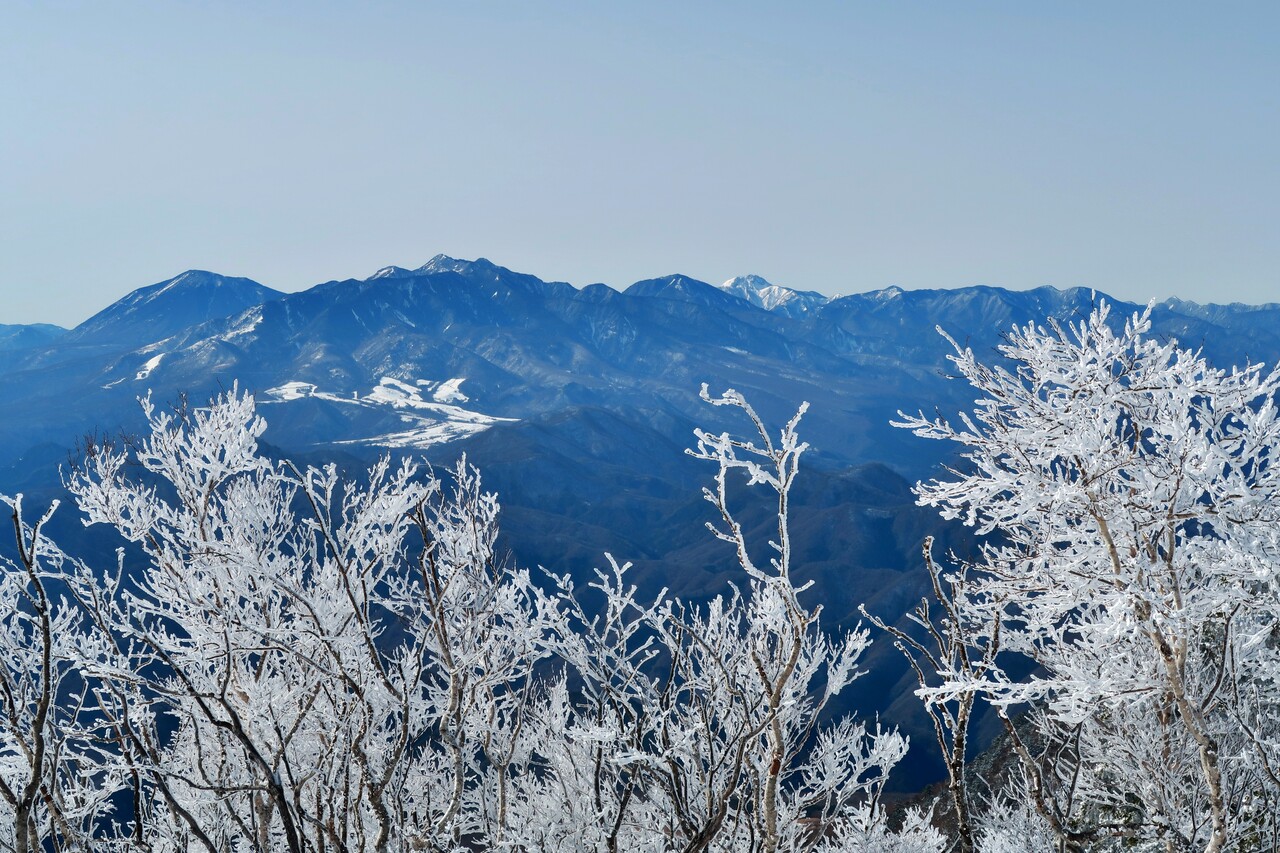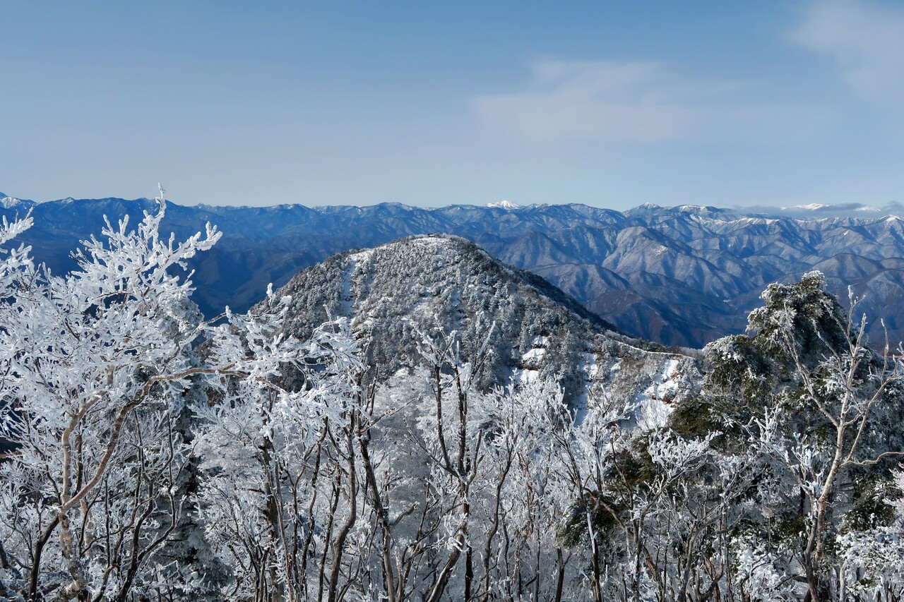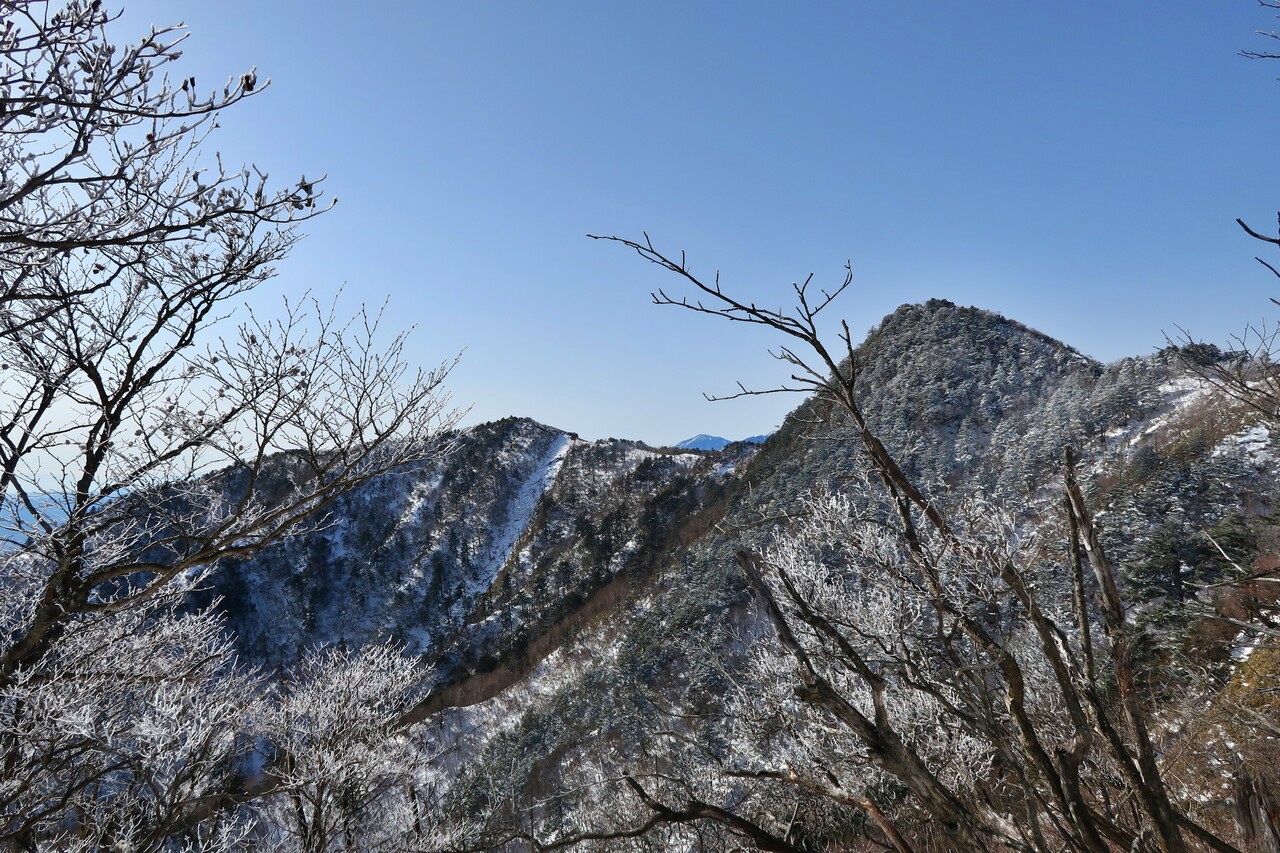 霧氷の木々越しの鶏頂山。