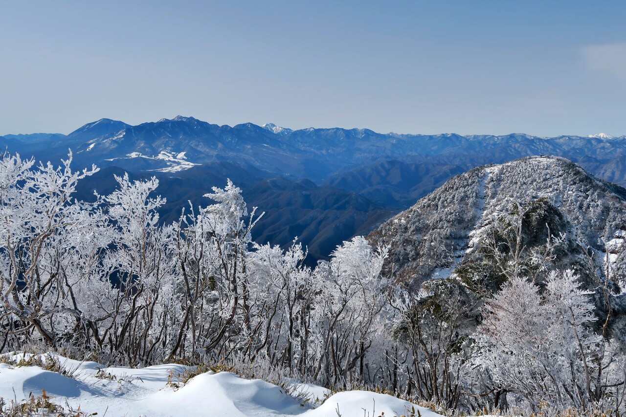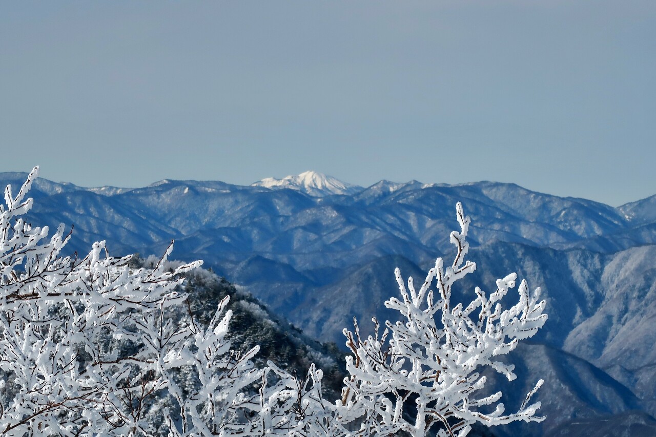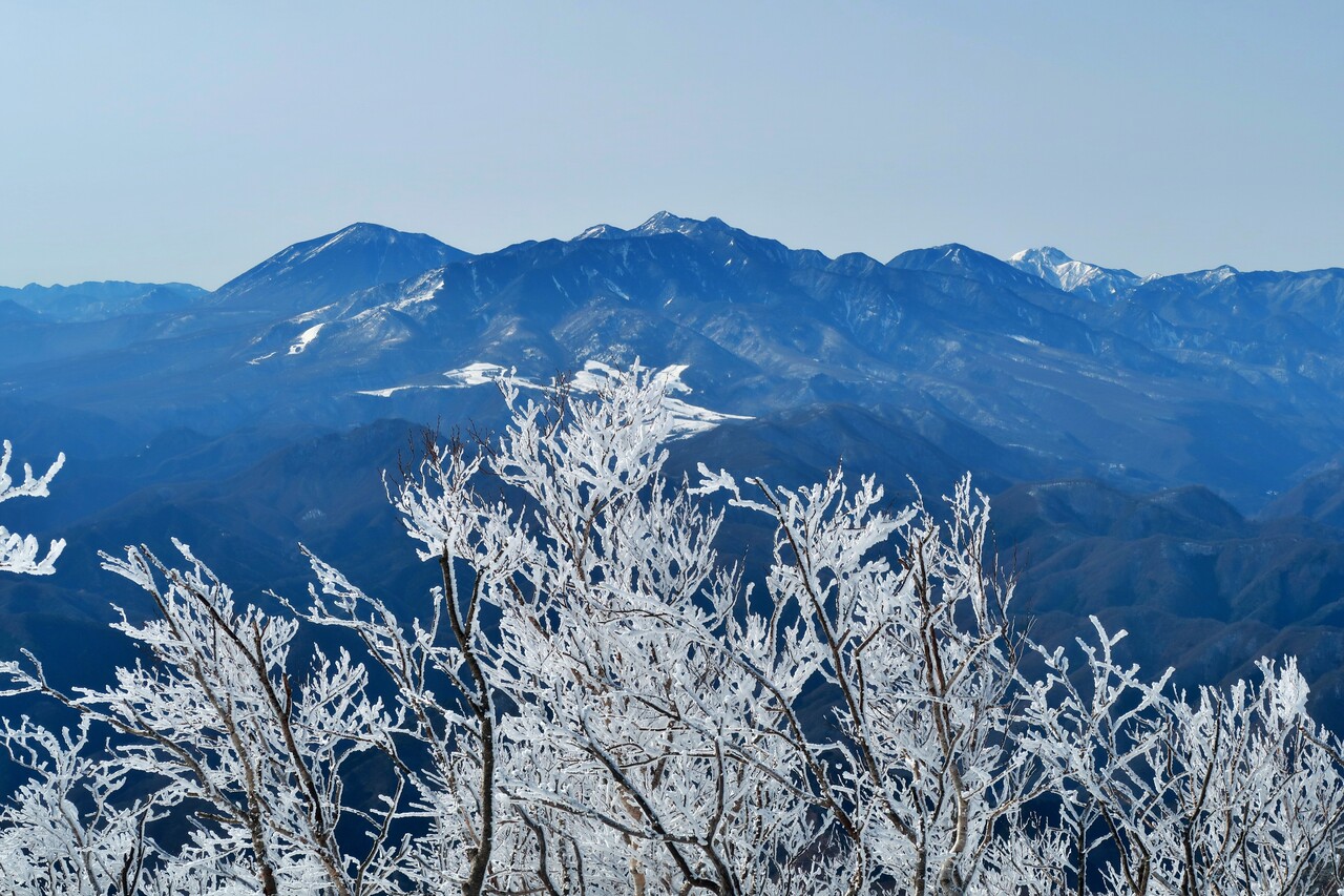 霧氷の木々越しの鶏頂山。
