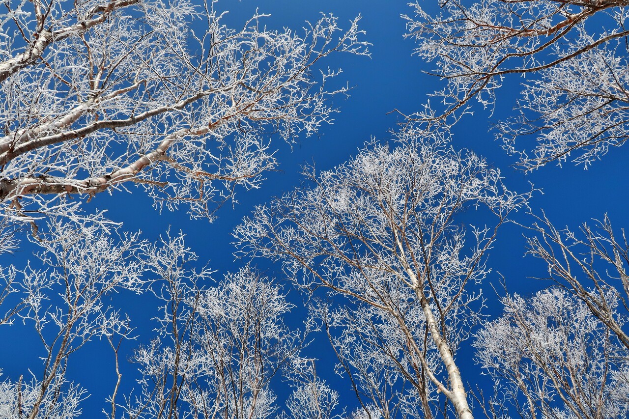 ダケカンバの枝先につく霧氷の華が、繊細なきらめきを放つ✨
