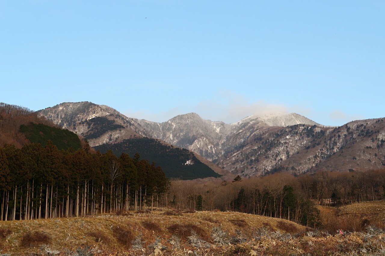 登山口に向かう途中、塩谷町の釈迦ヶ岳開拓付近から望む高原山。