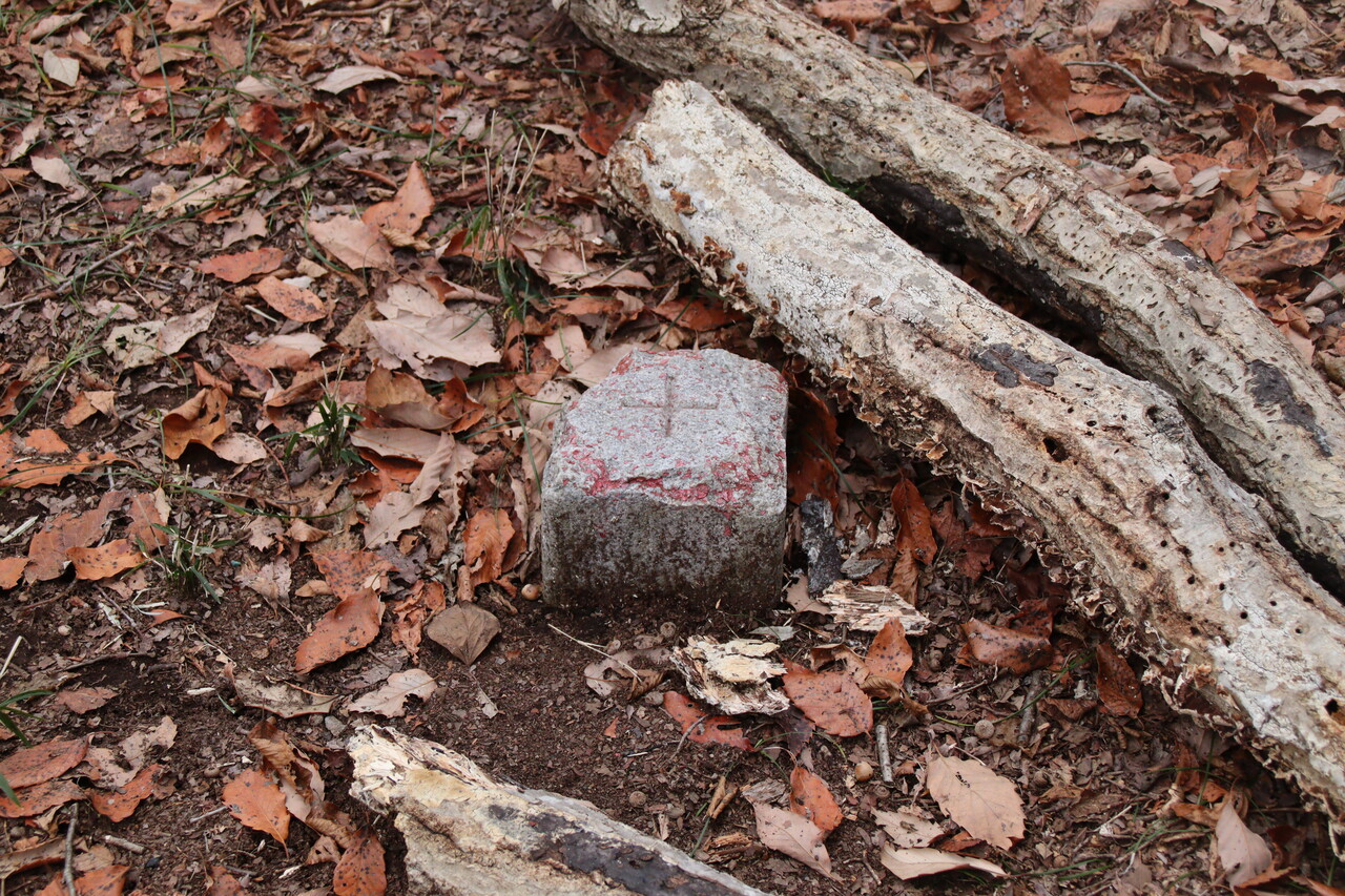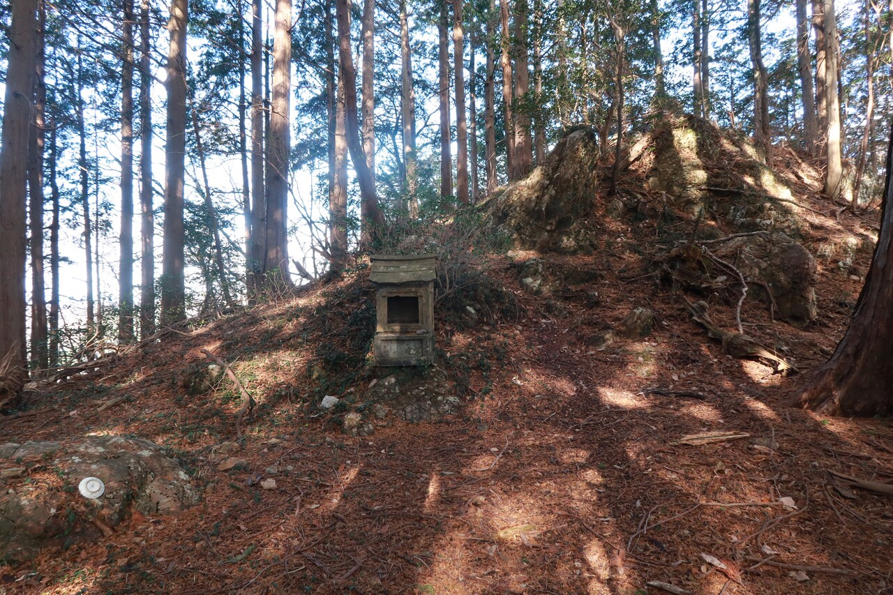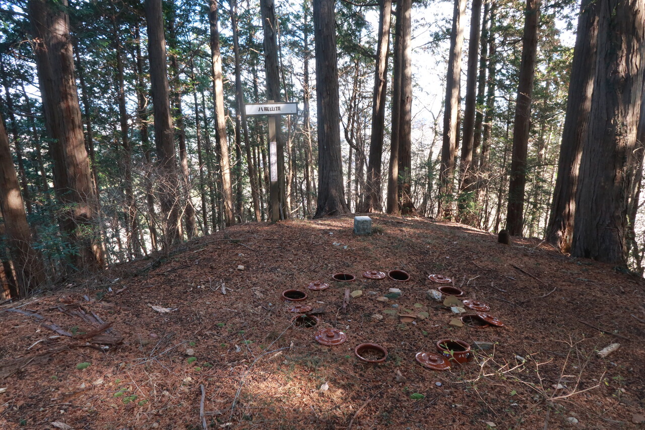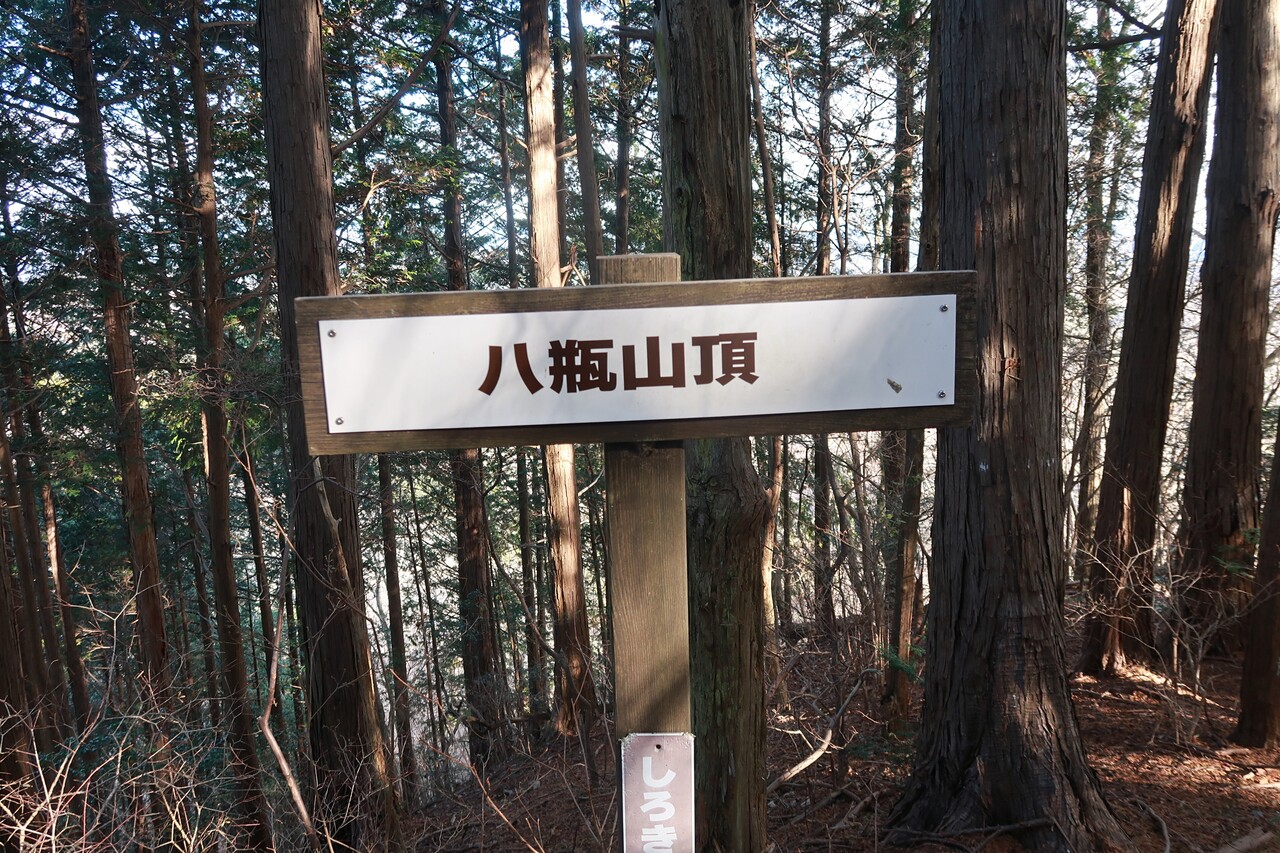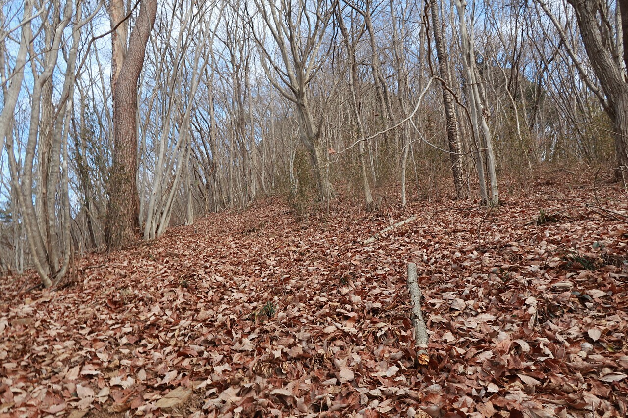 最初に登った八瓶山は落ち葉の急登、不鮮明な登山道であるが、山頂に置かれている八つの瓶が見どころの一つ。