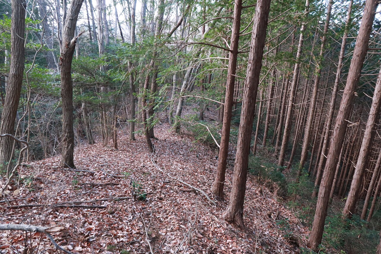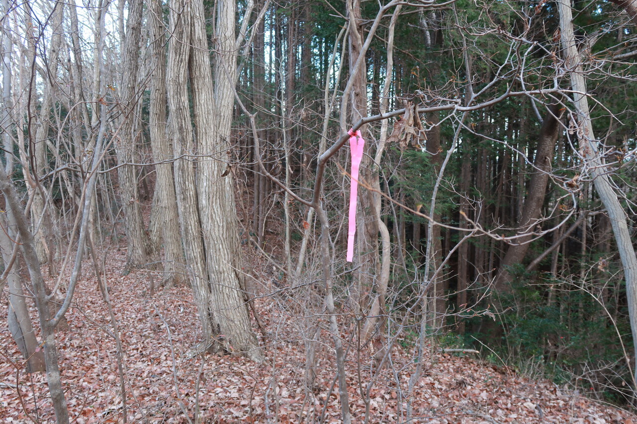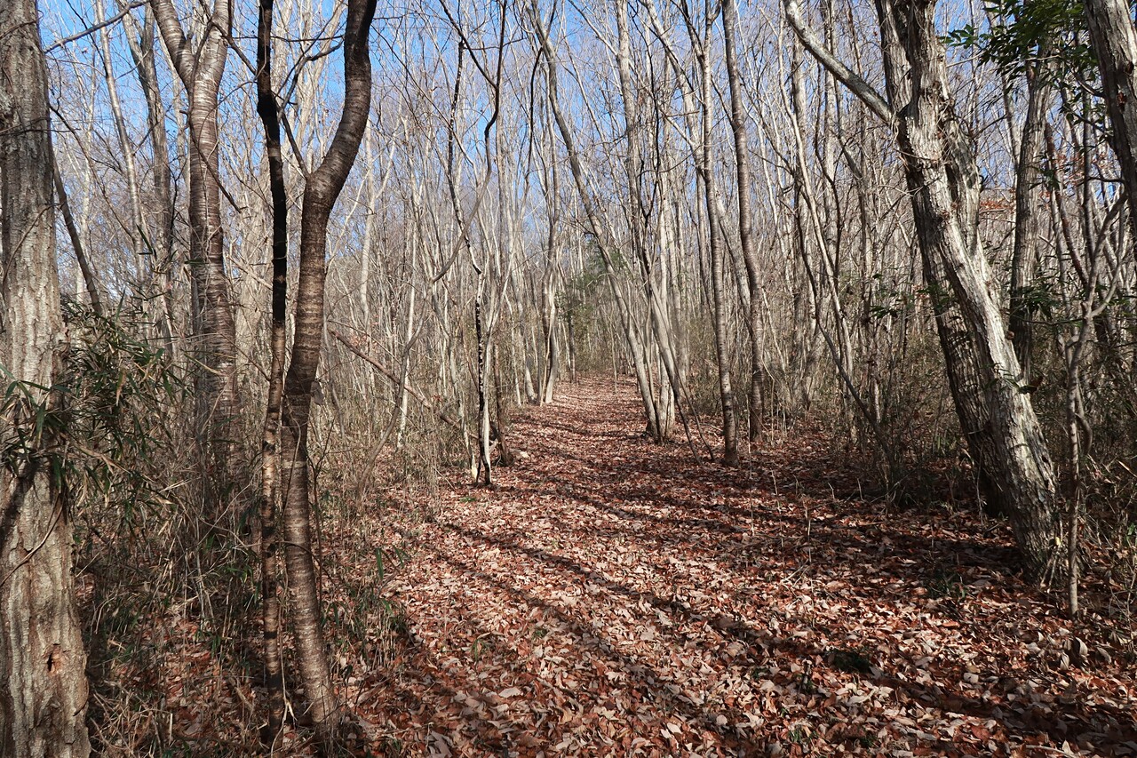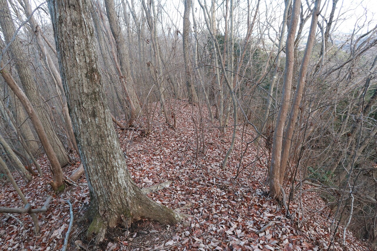 歩き易い尾根を選ぶと間違いで、山頂標識の裏手にある踏み跡不鮮明な急斜面を下って行くのが正解だった。
